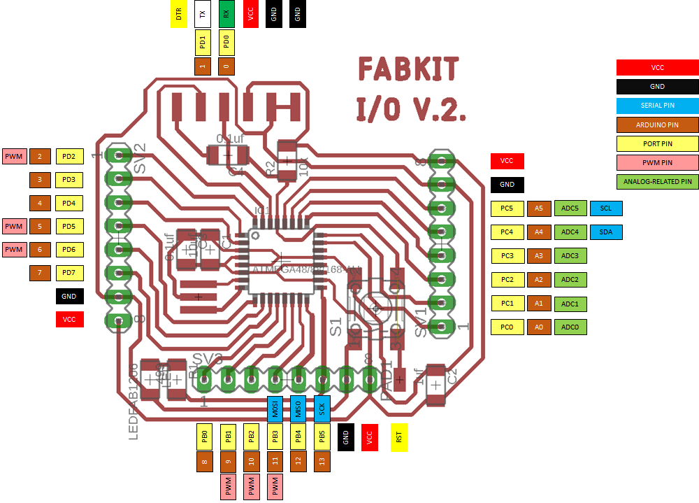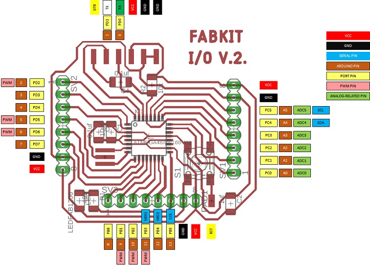 Based on the previous pinout of the AtMega328 microprocessor, I prepared this pinout of FabKit V2.0. I found it very useful to organize myself and not make wiring mistakes.