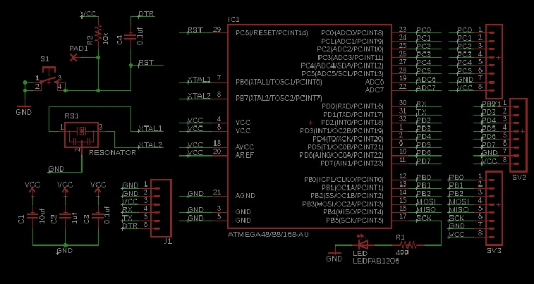As you can see in the schematic design, the microprocessor used is ATMega48 / 88/168-AU and it is in the FAB library it is compatible with the ATMega 328 which is the processor that I will use in both boards.