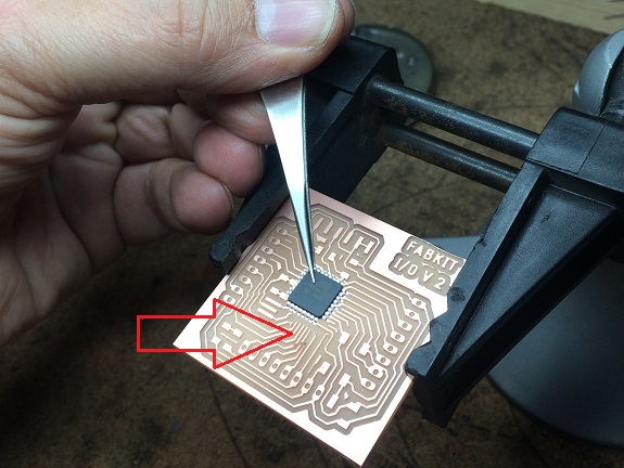In this image, I am placing the microprocessor on the PCB, you can see the missing track.