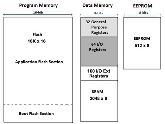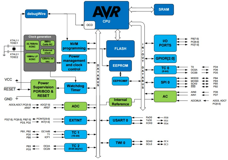 and it also counts with internal SPI and TWI modules which permit it to comunicate in SPI and I2C protocol respectively.