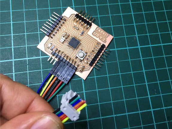 In the I2C protocol, two controllers (fabduino) communicate by sending signals through a medium, in this case a Ribbon cable. The transmission is from the slave to the master through the pins of the processor. I chose to send the signal by pin 8.