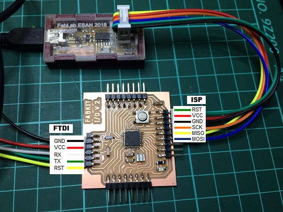 The next step was to connect the Fabkit by means of the ISP cables to the Arduino and change the definition of the board and the programmer by Atmel Atmega328p and "Arduino as ISP".