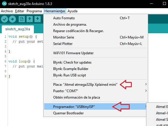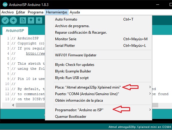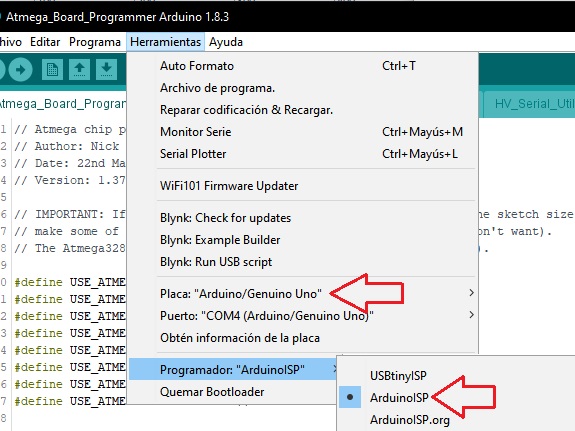 Then, I selected the Arduino board and ArduinoISP as a programmer, to record the sketch on the Arduino.