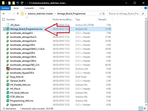 I downloaded the files and loaded the sketch "Atmega_Board_programmer.ino"