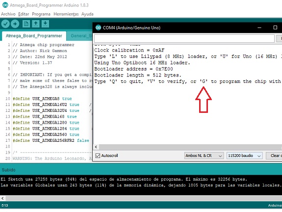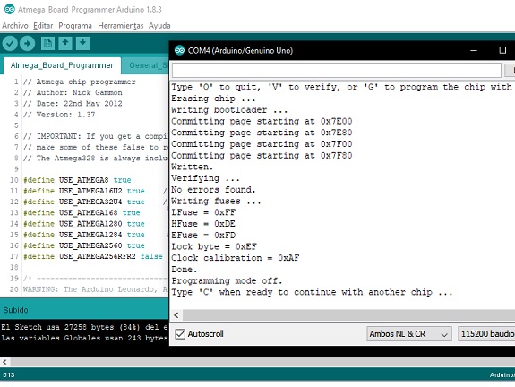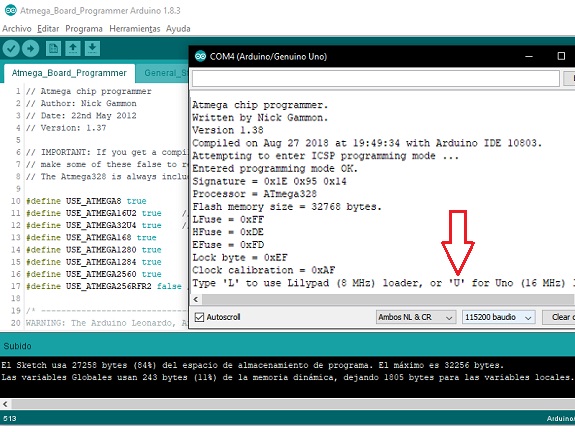In the following image the Arduino board connects to the Atmega328 microprocessor and extracts information, then waits for the resonator frequency to be selected, in my case, as I used a 20MHz resonator I selected the "U" option.