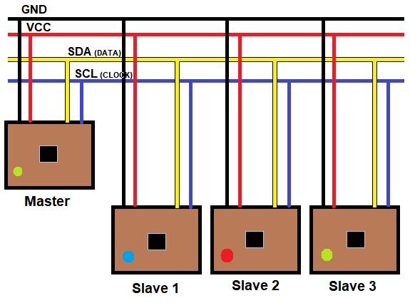 To create an i2C communication all Fabkits must be connected to the SDA and SCL pin between them. They will also share land and Vcc; as in the following figure.