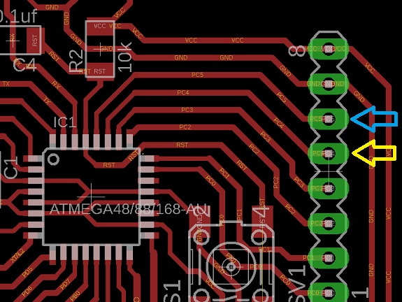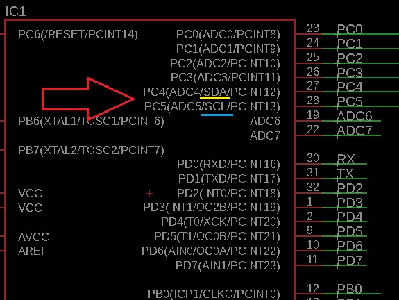 To determine which are the SDA (data) and SCL (clock) pins, I used my schematic diagram. The SDA corresponds to the PC4 pin, and SCL to the PC5 pin.