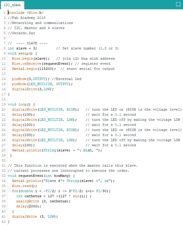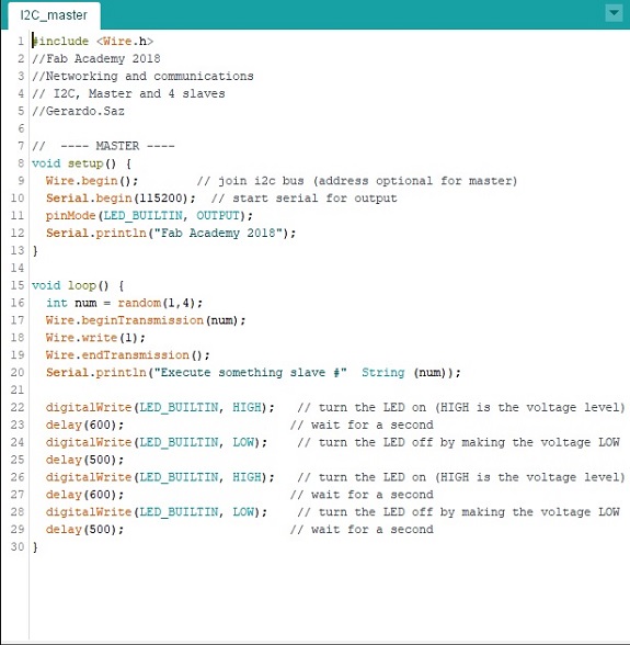 In the following video, you can see when the Master randomly sends the command to a Slave through the i2C data bus, the slave interrupts the process in which it is doing (internal Blink Led) to attend the Master order (external blink led) , then it continues at the point where its process was interrupted.