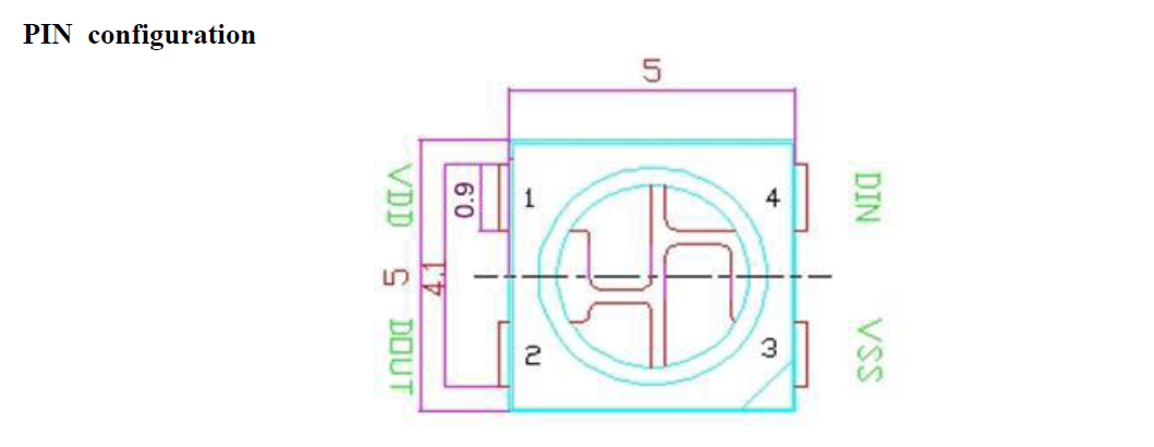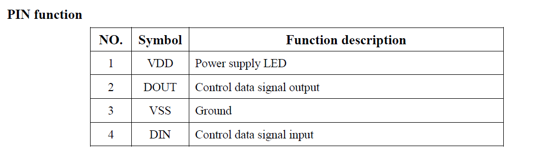 The data transfer protocol use single NZR communication mode. After the pixel power-on reset, the DIN port receive data from controller, the first pixel collect initial 24bit data then sent to the internal data latch, the other data which reshaping by the internal signal reshaping amplification circuit sent to the next cascade pixel through the DO port. After transmission for each pixel,the signal to reduce 24bit. pixel adopt auto resha-ping transmit technology, making the pixel cascade number is not limited the signal transmission, only depend on the speed of signal transmission.