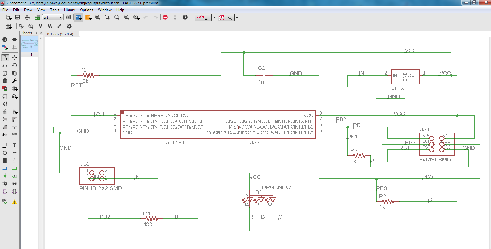 I used Eagle which I have gotten familiar with too design the board for the components I used the components from the fab library that I had importred as a library in th software. Started by first creating a new project then I created a new schematic by creating right clicking the project then new project. Then I used the add components button to add the components I needed. Then connected the components using the green connector tool and gave it the necessary labels as shown.