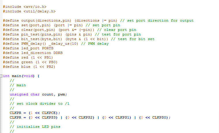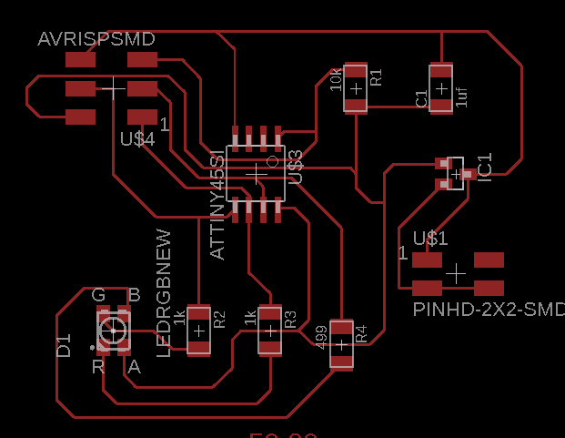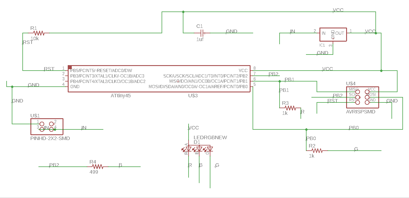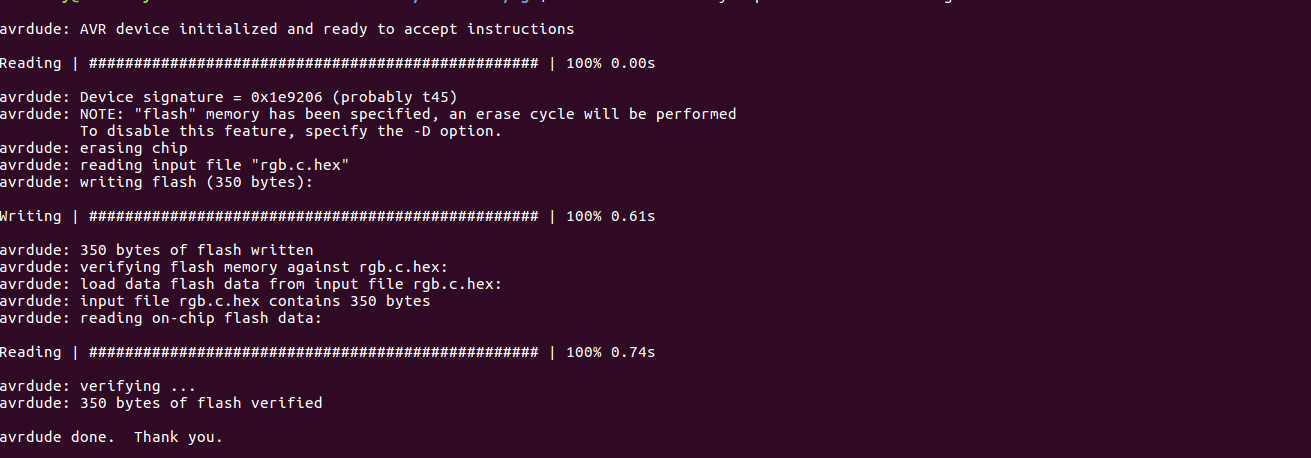I programmed the board using the code online and the makefile. I used the pwm concept to make a few changes to the code where i delayed it from 25 microseconds at first then to 10 microseconds the second video. The command that I used Avrdude command avrdude -c usbtiny -p t45 -u -U flash:w:rgb.c.hex:i