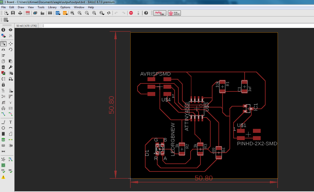 What followed was the screen board for it that I generated using this button. I gave the board dimension of 50 by 50 mm, rearranged the components inside the box by dragging them. used the rotation button to put them in the direction I wanted them to face using this button.