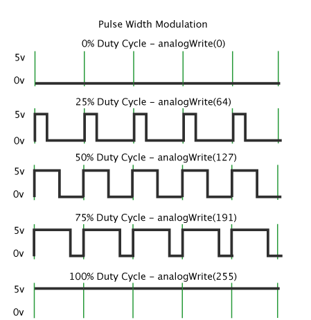 In the graphic below, the green lines represent a regular time period. This duration or period is the inverse of the PWM frequency. In other words, with Arduino's PWM frequency at about 500Hz, the green lines would measure 2 milliseconds each. A call to analogWrite() is on a scale of 0 - 255, such that analogWrite(255) requests a 100% duty cycle (always on), and analogWrite(127) is a 50% duty cycle (on half the time) for example.