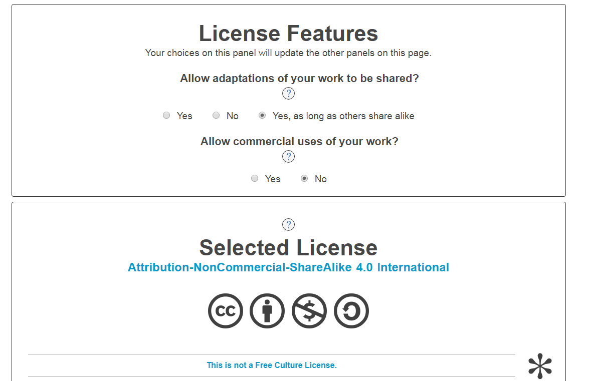 Creative commons has diffrent licenses with diffrent requirements, I decided to go with the Attribution-NonCommercial-ShareAlike which was moe suitable for the project. I just opened their site as shown to apply for a license. Then selected the option sthat I wanted as shown.
