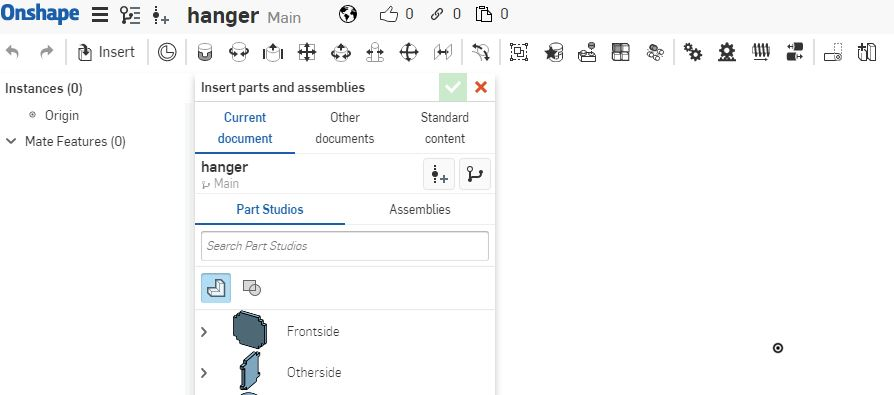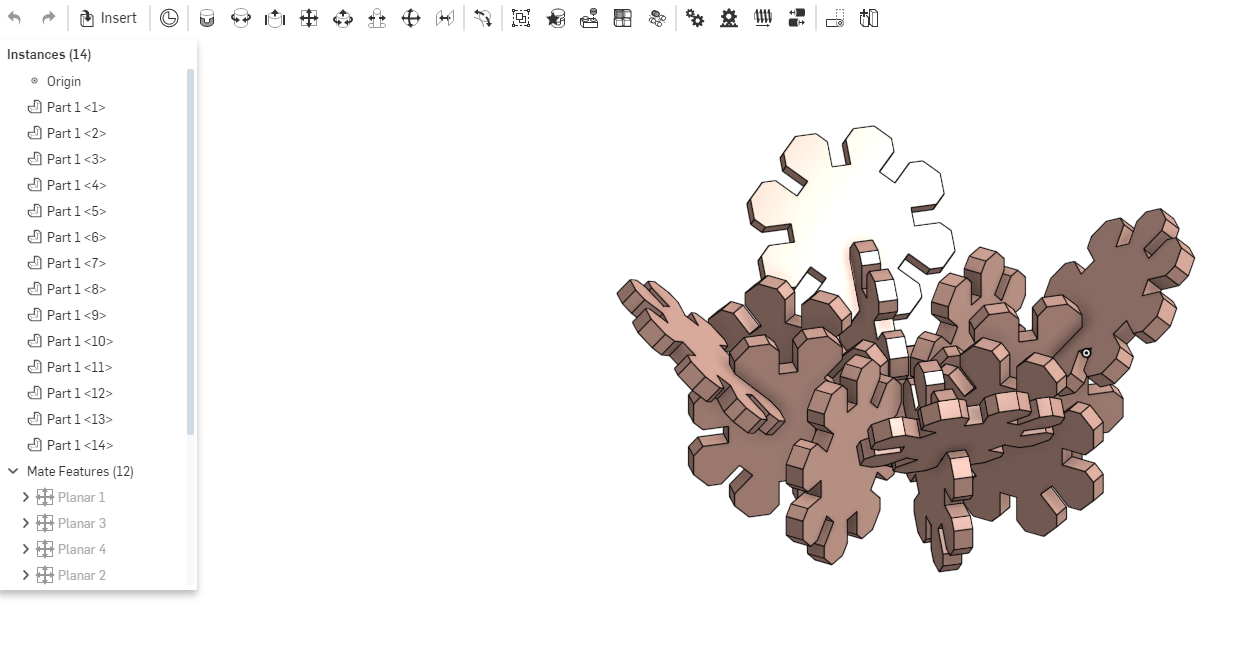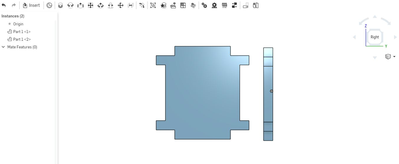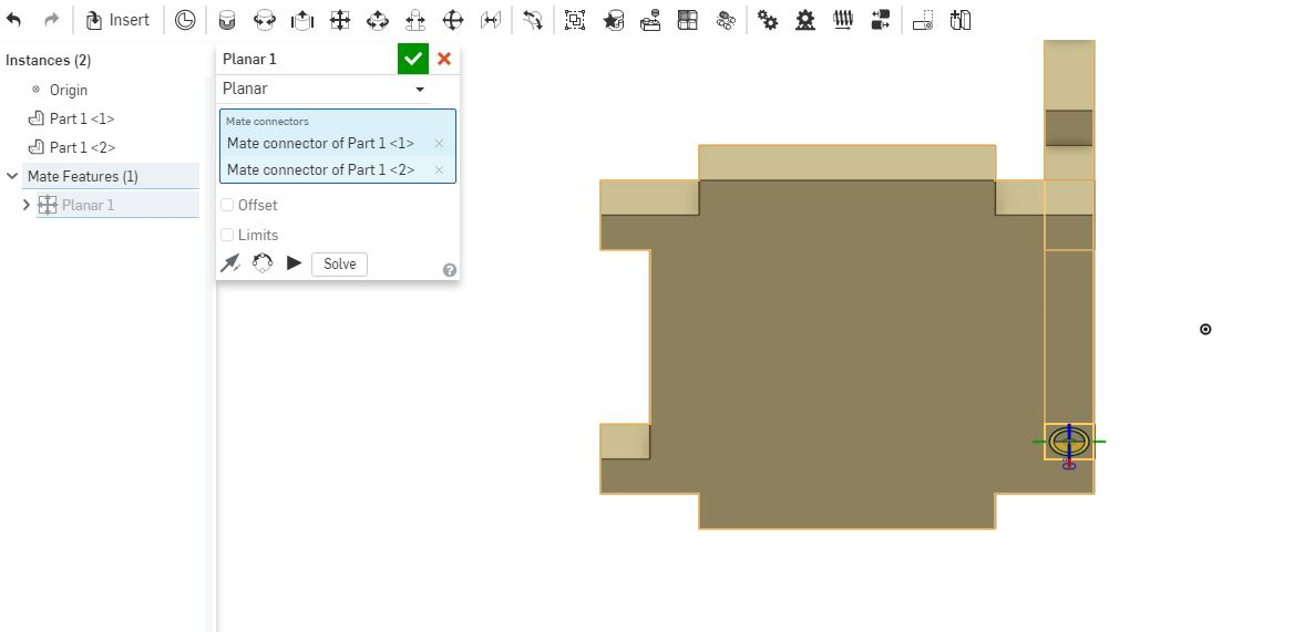 Then used the insert button to select the shapes and drag them to the newly created assembly. The palnar mate tool connects the different planes together to form a join them as shown.