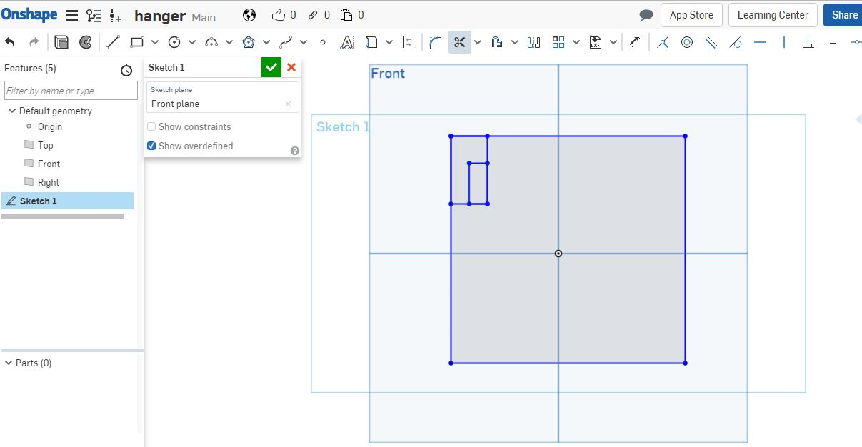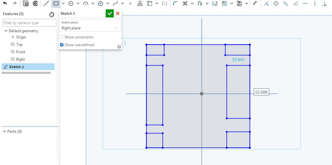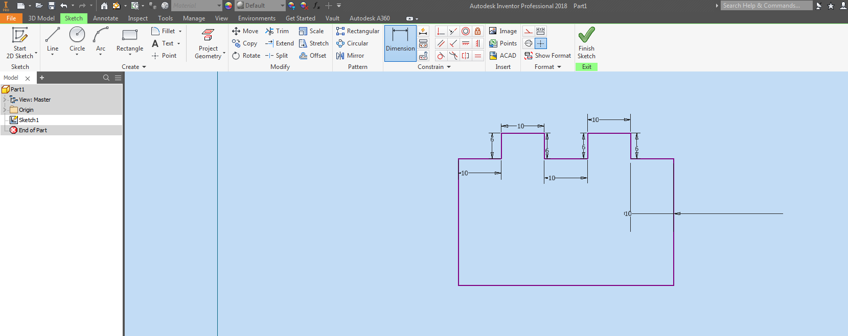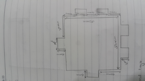 I decided to use inventor to design it as continuation to learn how to use it. I started with a 2D design. I did a large rectangle then smaller ones protruding outside. I trimmed off the excess lines then I gave them measurements.