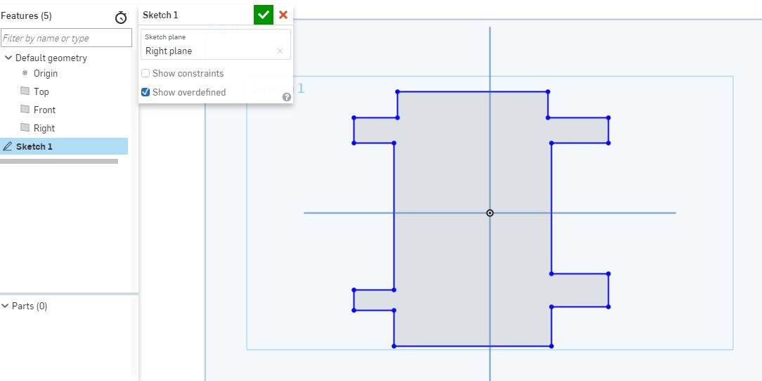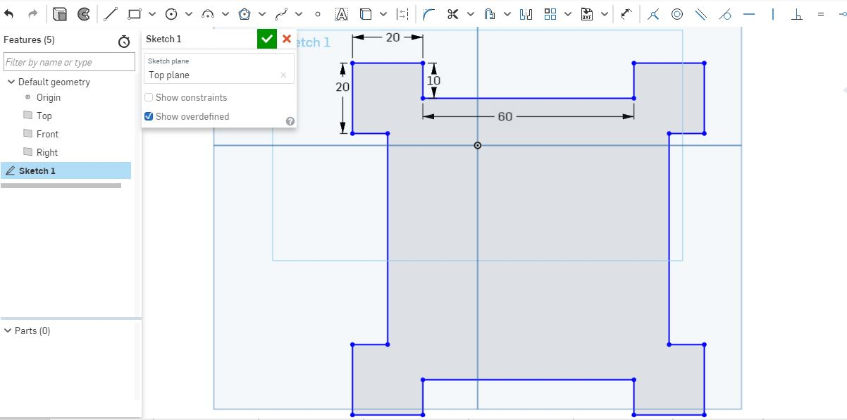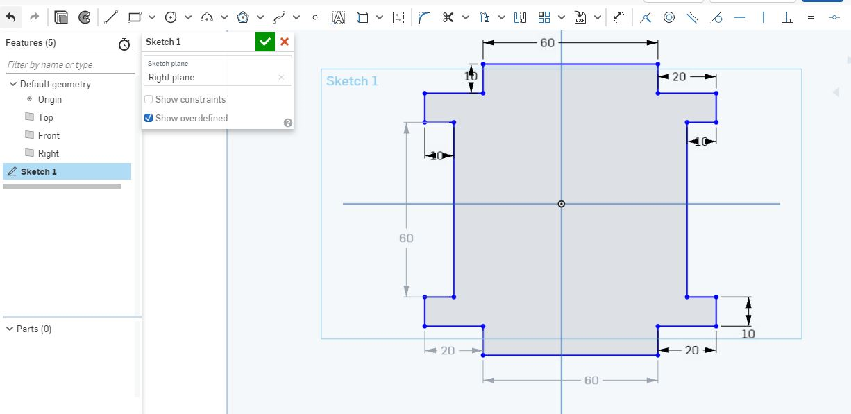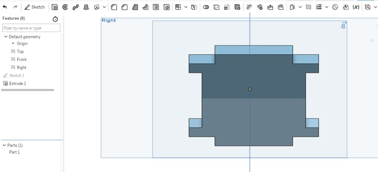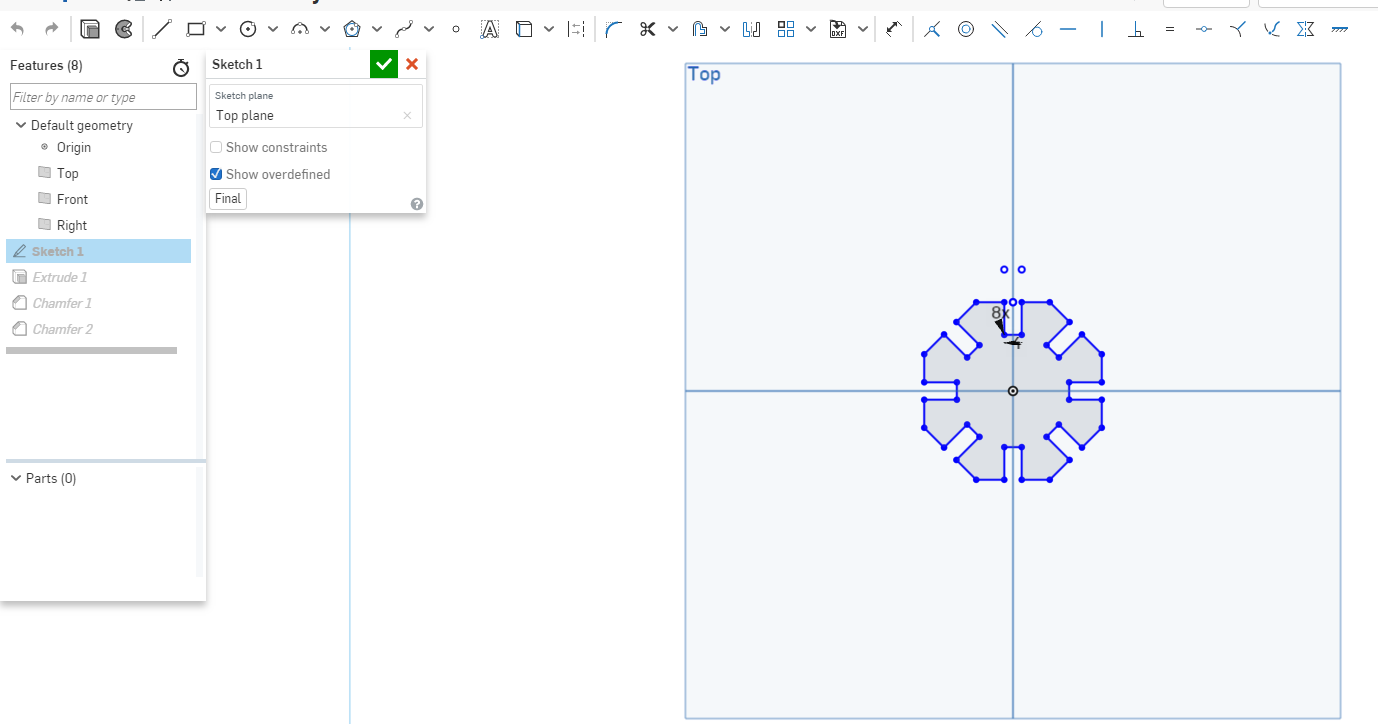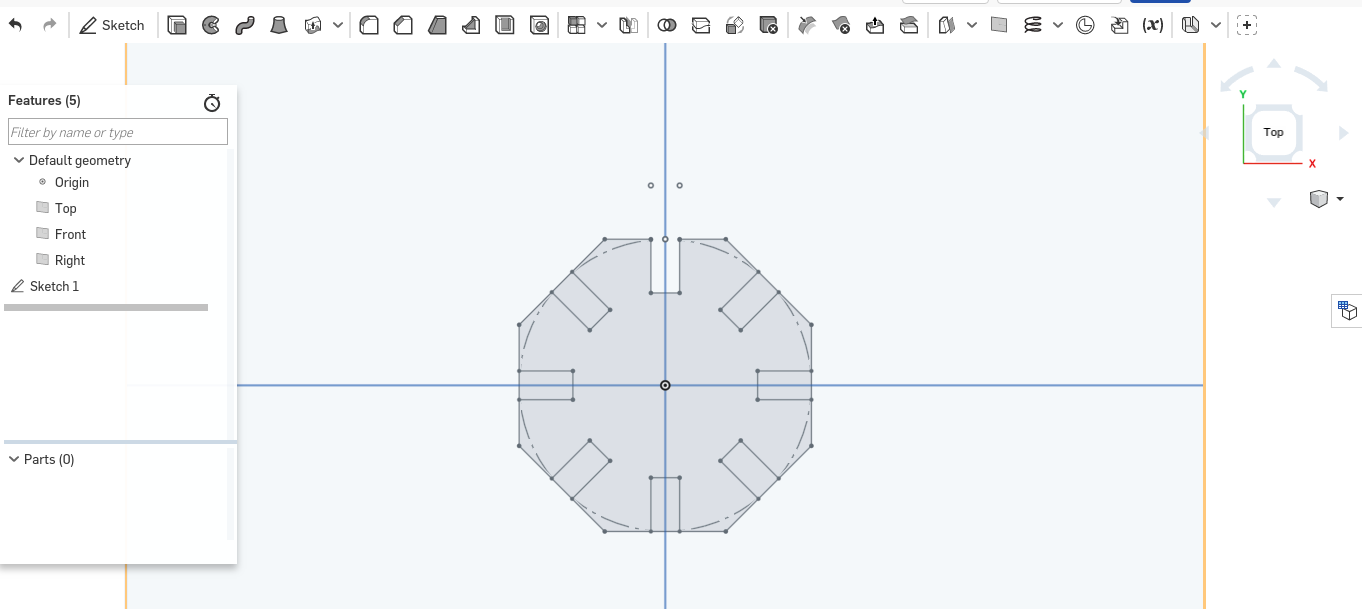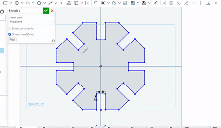I redid the pressfit using onshape, started with a sketch then I drew a polygon shaped using the polygon tool as shown and then added the number of sides. To make the insertions I used the line tool to make a rectangular shape at the middle line between the corners. Using the circular pattern tool I recopied the rectangular shape design all around the hexagon to make it uniform throughout the design.