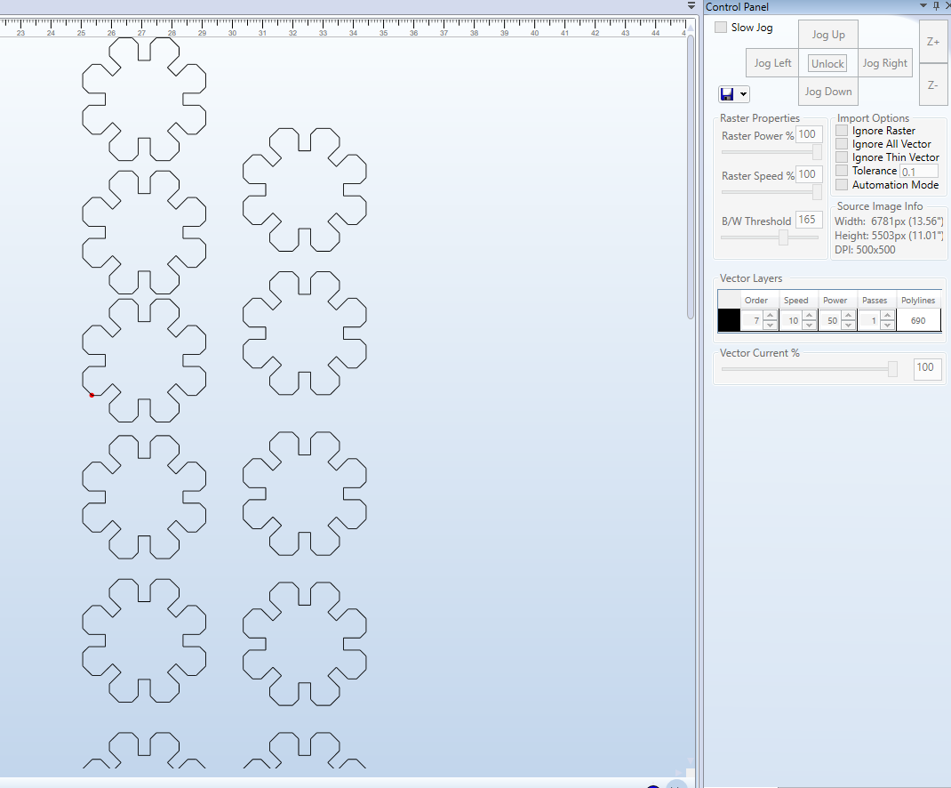I imported the pressfit design in the inkscape software then made a few copies of the design and loaded it to the engrave software for the lasercutter. I made sure the lasercutter is homed and set the correct settings for cutting that is the speed, power and passes as shown. I used the acrylic material of 4mm thickness.