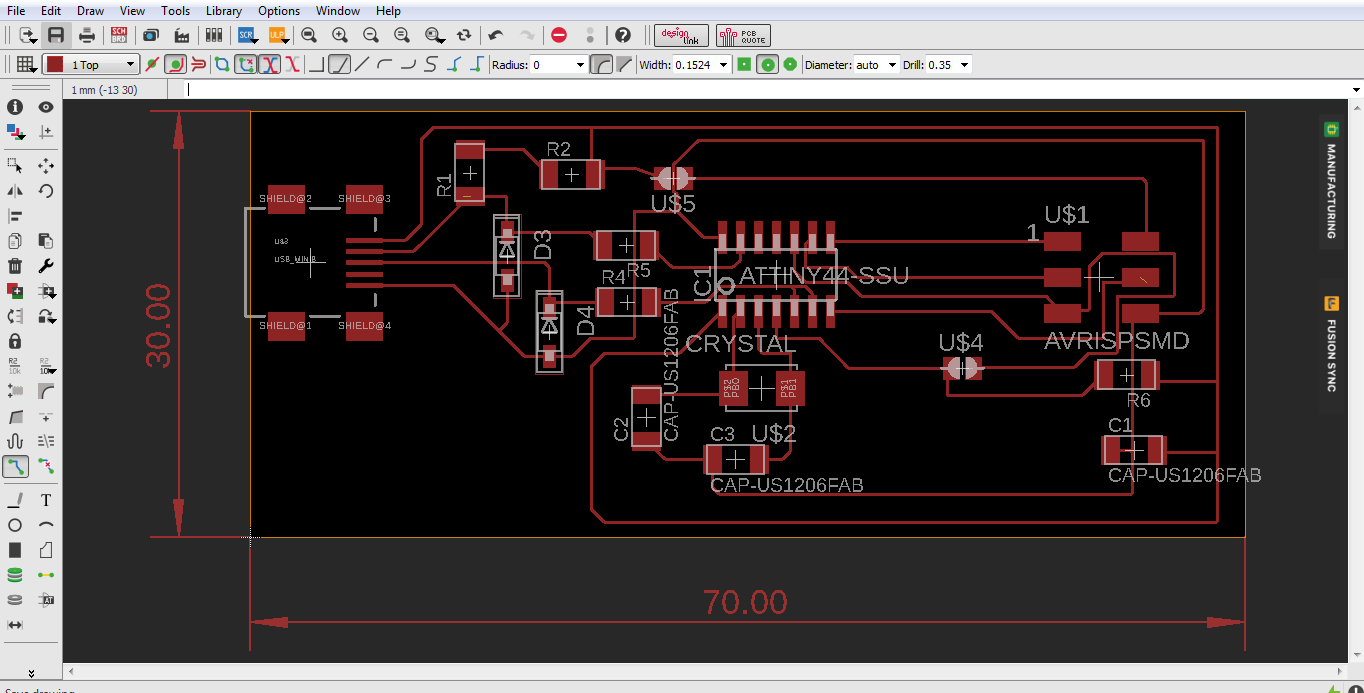 I used the 70 by 30 mm measurement dimension for the PCB. Rearranged the compnents on those dimentions to fit the exact measurements. I had a bit of challenge with arranging the components and their connections soo I went back and forth between the schematic board and the screen board.