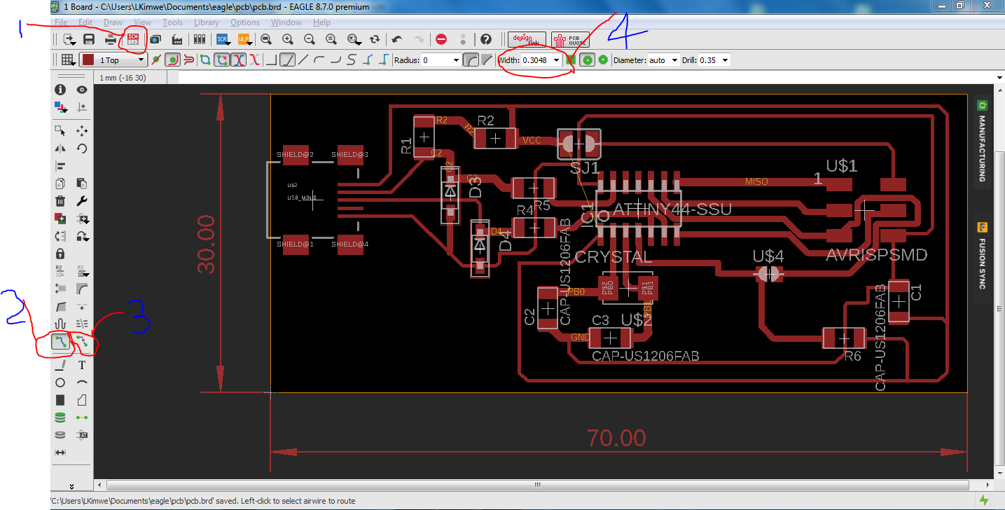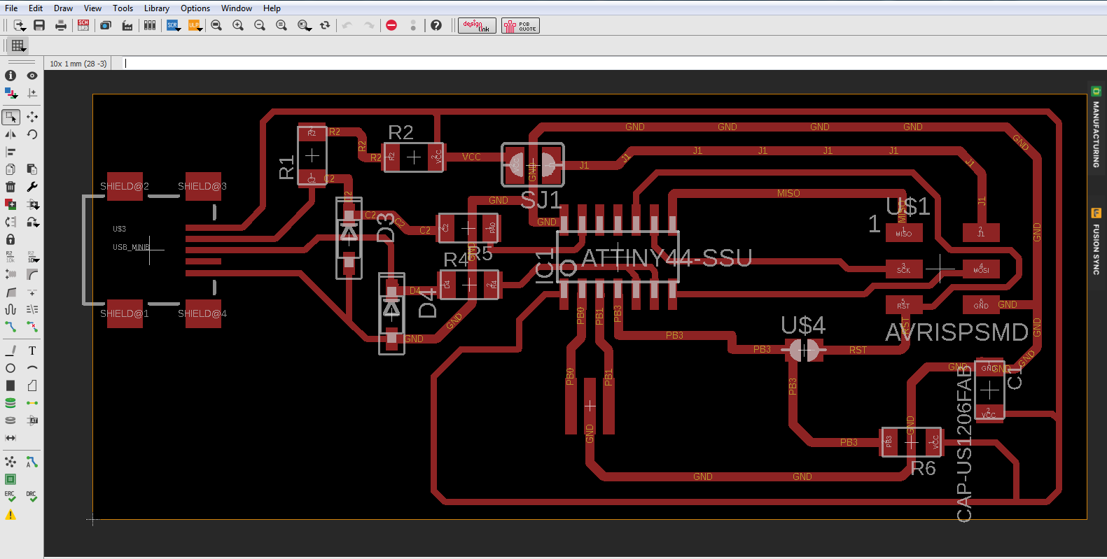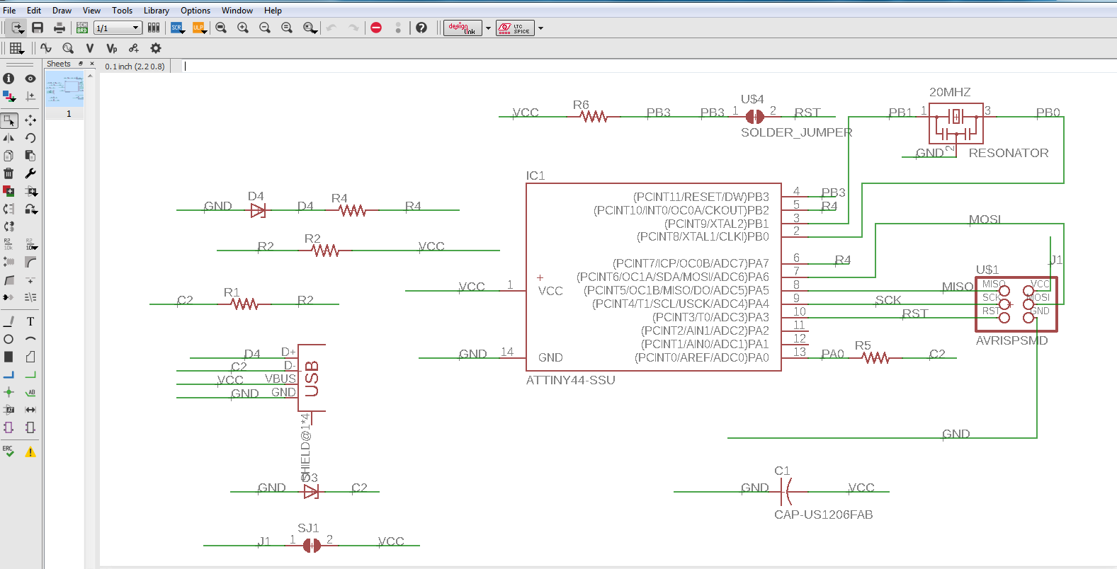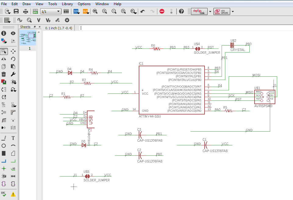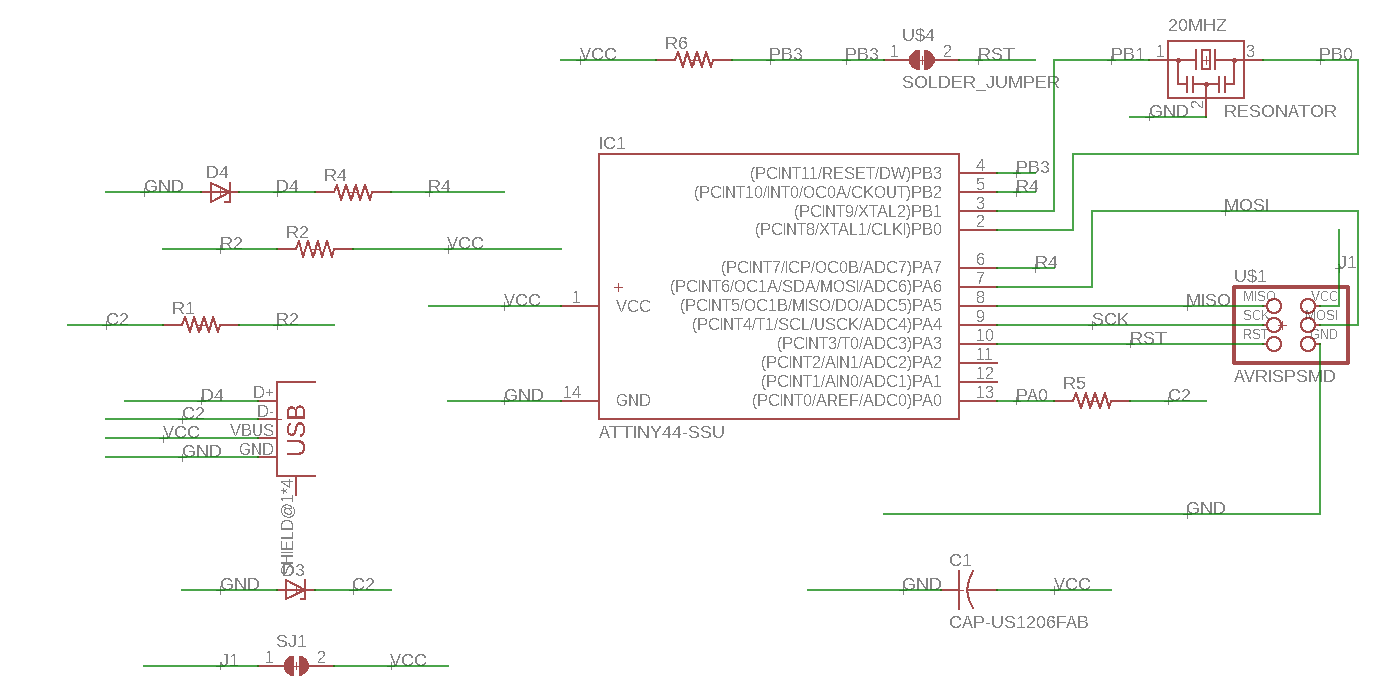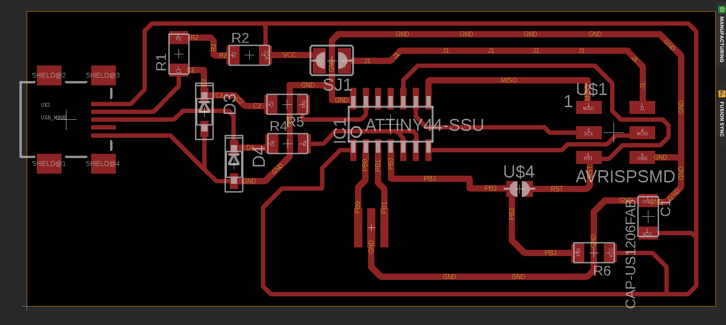I designed it using eagle as shown below. the components were imported from the fab library. I struggled with the connections at first and labelling them. For this I used ATtiny44.