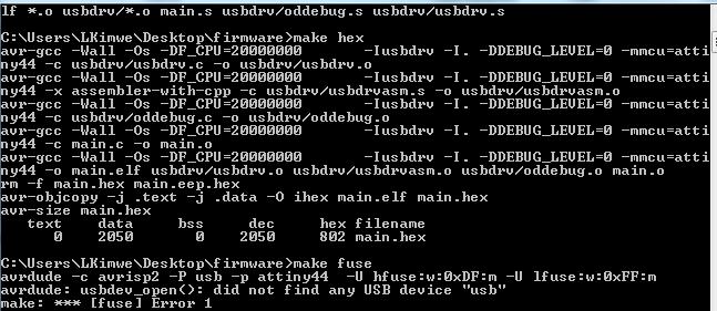 The command for make fuse brought an error. I looked for solutions and one of them was to edit your code to the specific programmer you are using, in this case i changed it from AVRDUDE = avrdude -c avrisp2 -P usb -p $(DEVICE) # edit this line for your programmerto#AVRDUDE = avrdude -c usbtiny -p $(DEVICE) # edit this line for your programmer.The same erroe appeared again.