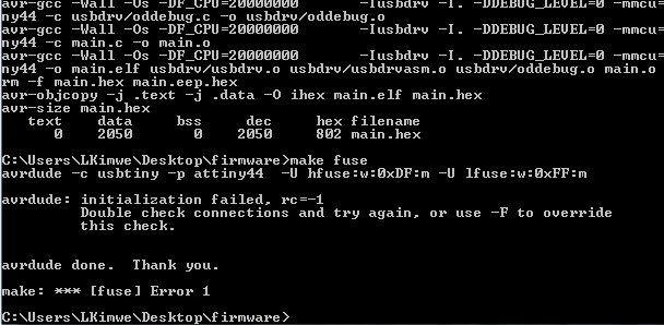 I started programming the board through command prompt.I cd into the firmware directory in the desktop then used the make clean command as from instructions to compile the firmware. It gave me a successful message then I run make hex it also gave a successful message.The next command is make fuse which returned an error as shown below.