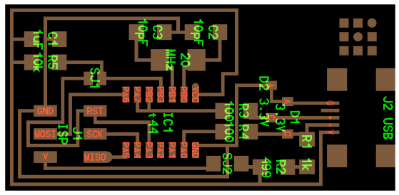 I redesigned the board beacuse I had a resonator and not the crystal so from the design I removed the crystal and the capacitors, replaced them with the resonator. Used the board below for referencing.