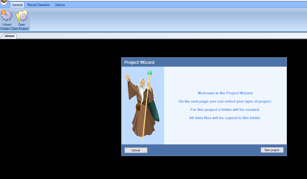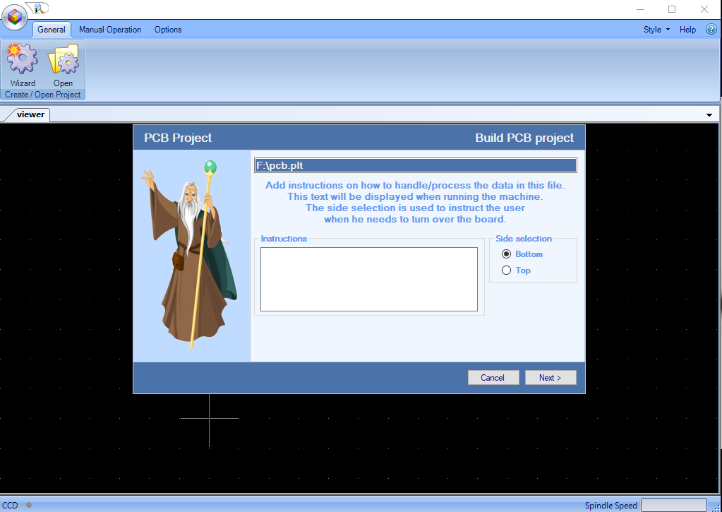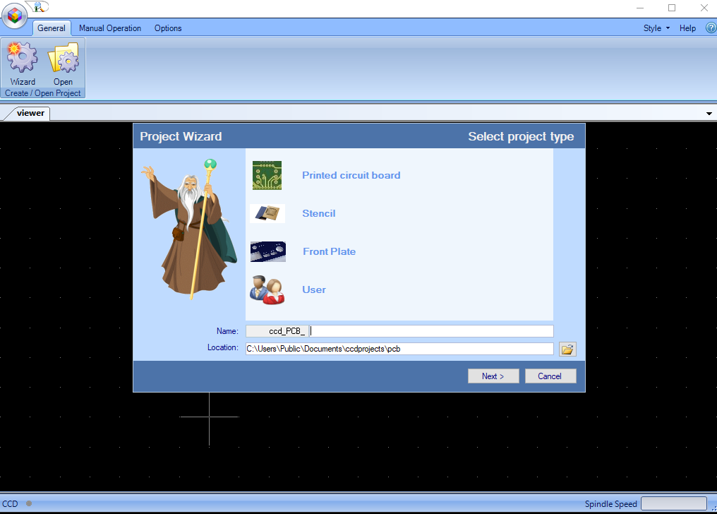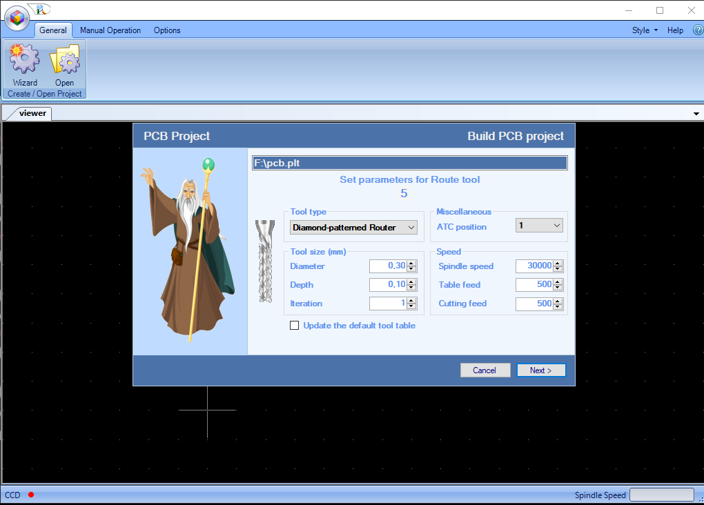 The CNC milling machine uses the RoutePro3000 software for milling. I opened it and started a new wizard to create a new project as shown.