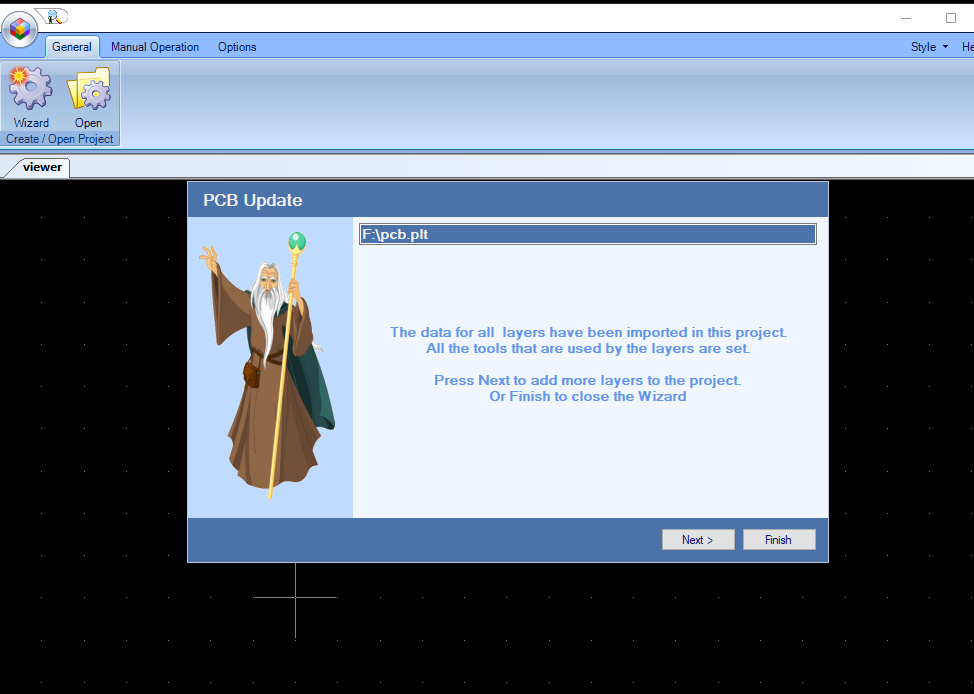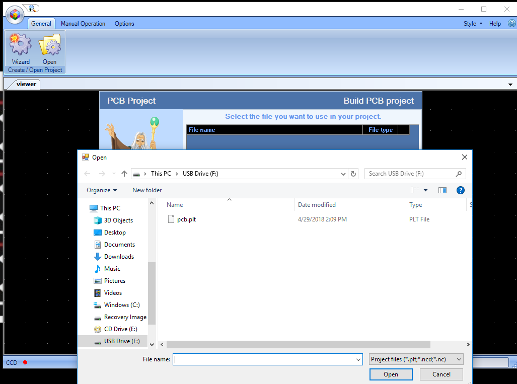 Then I selected the printed circuit board option, gave it a name at the input field. Pressed next to choose the plt file.