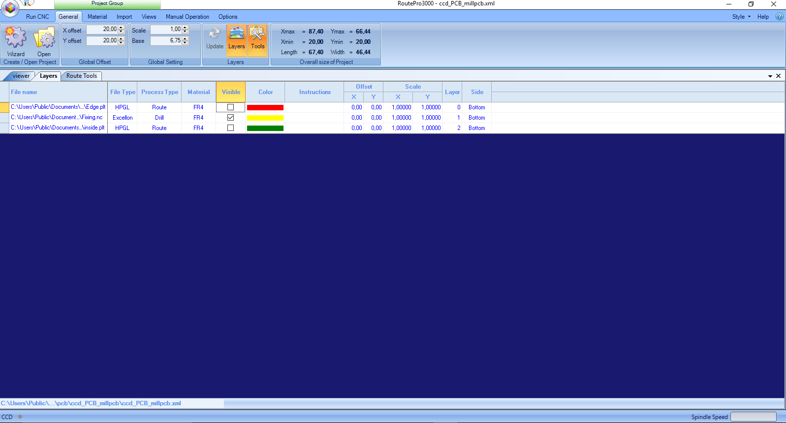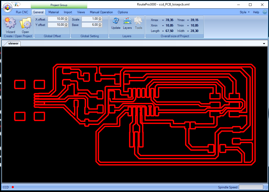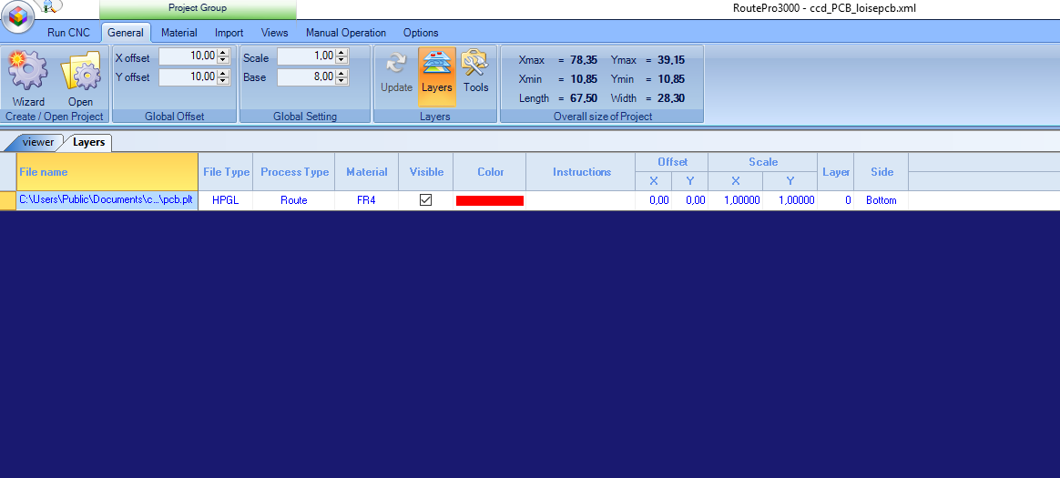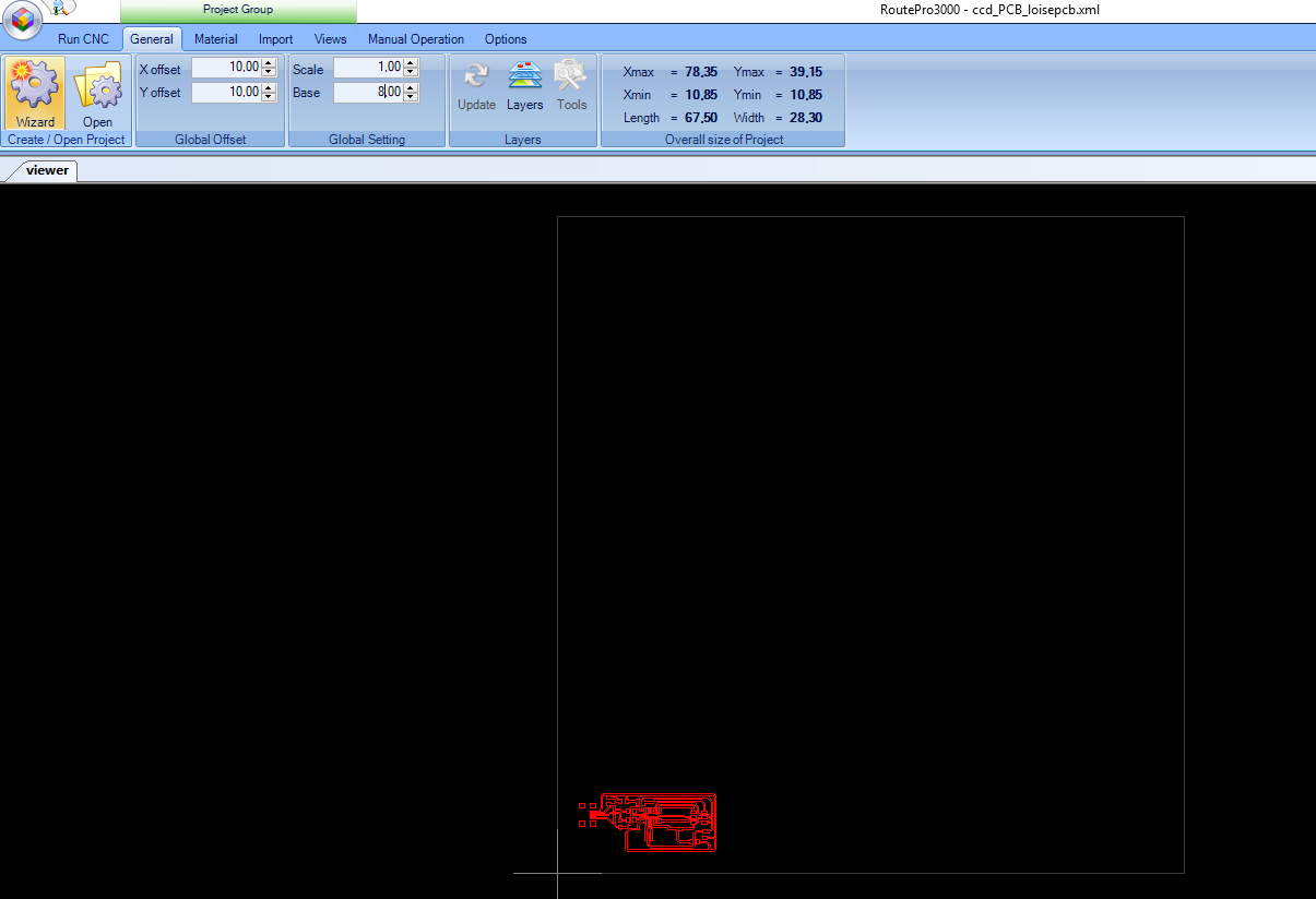 Under General I changed a few things like the base where I logged in the size of the material holding the board to be milled.THe offset I put 10 by 10 for both the x and y axis.