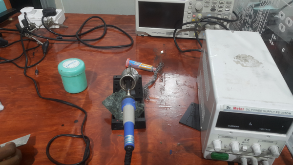 I used the solder flux to oil the board to avoid solder from geting to the lines and causing short circuit. Then I used the solder paste, you just apply a little on the board then you blow it using a hot air rework station don't use too much heat. Then i used the soldering wire for other parts of the board as shown.