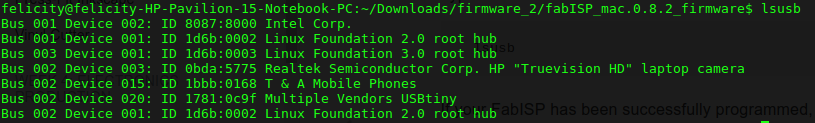 To test I typed the command lsusb on terminal and the results were as shown. The device was seen as Multiple vendors USBtiny