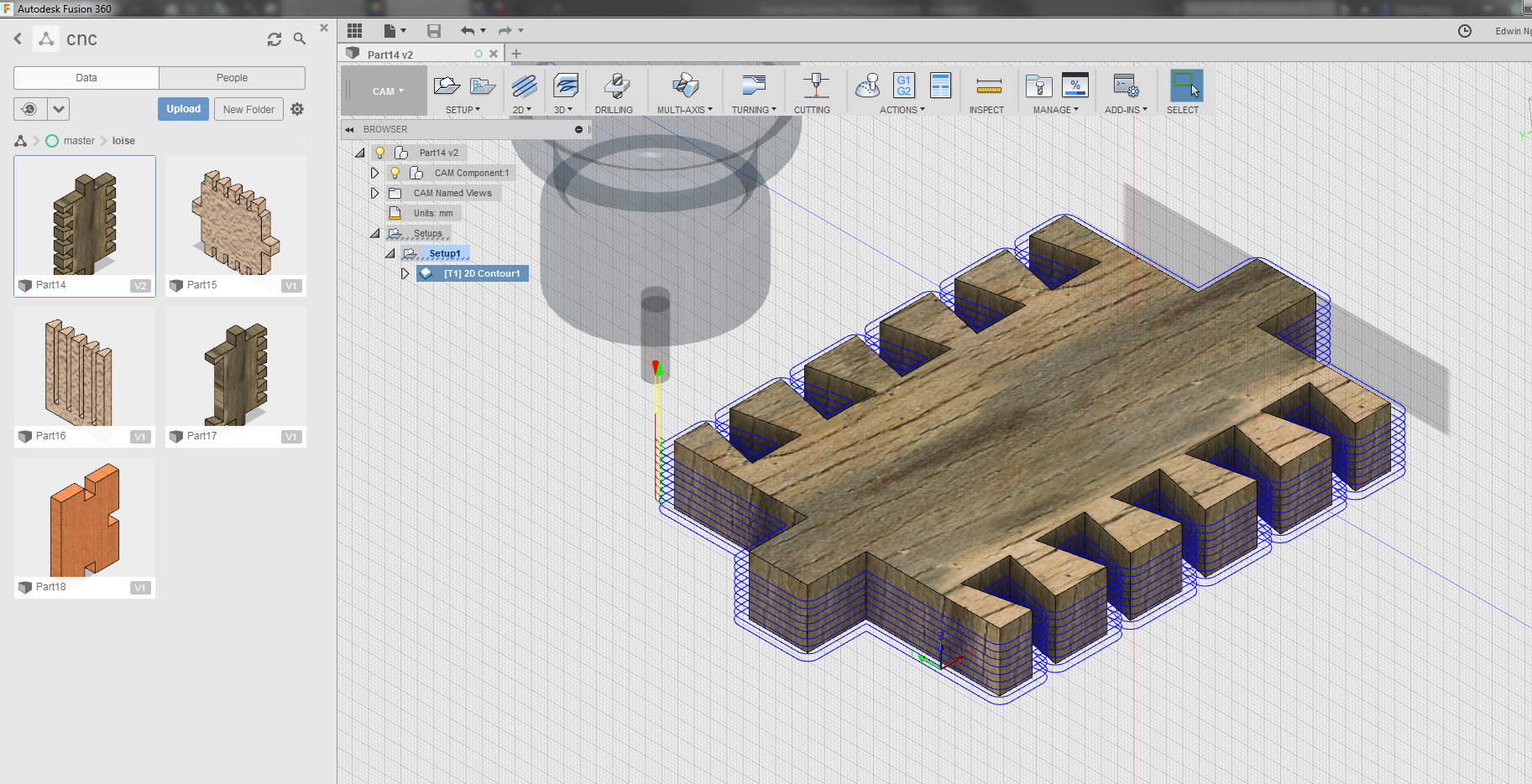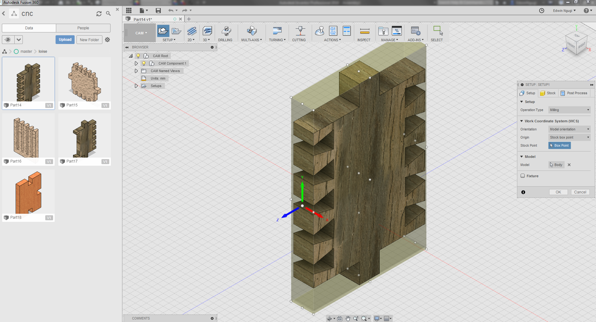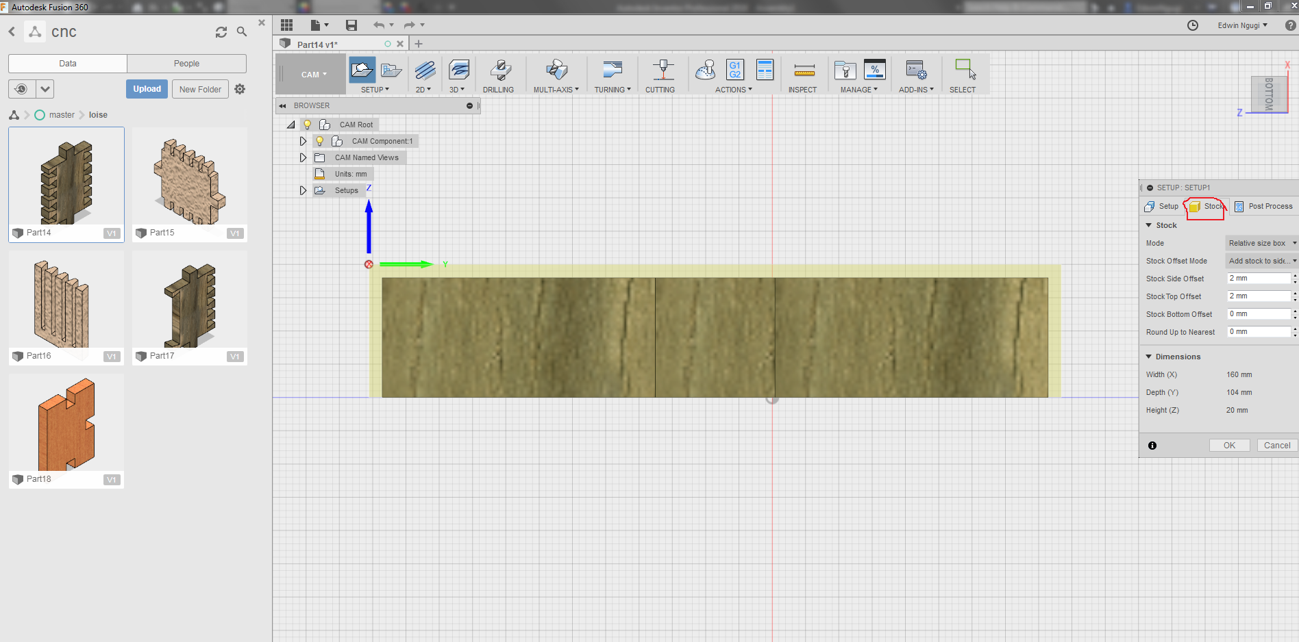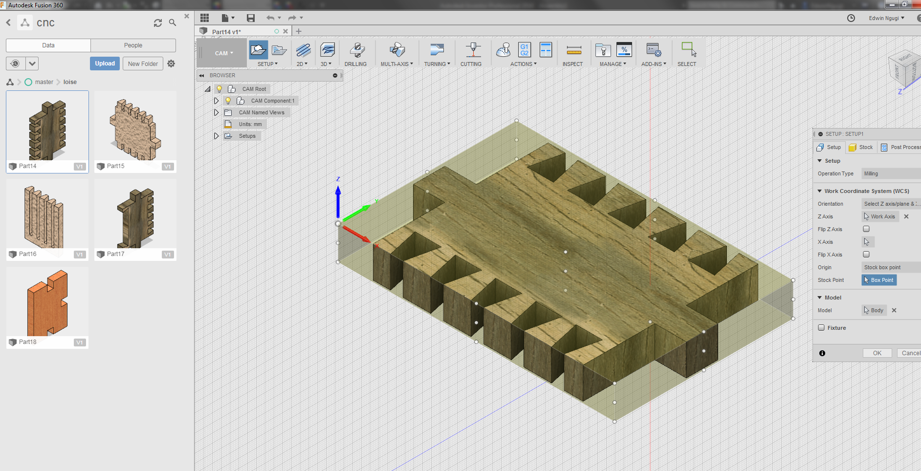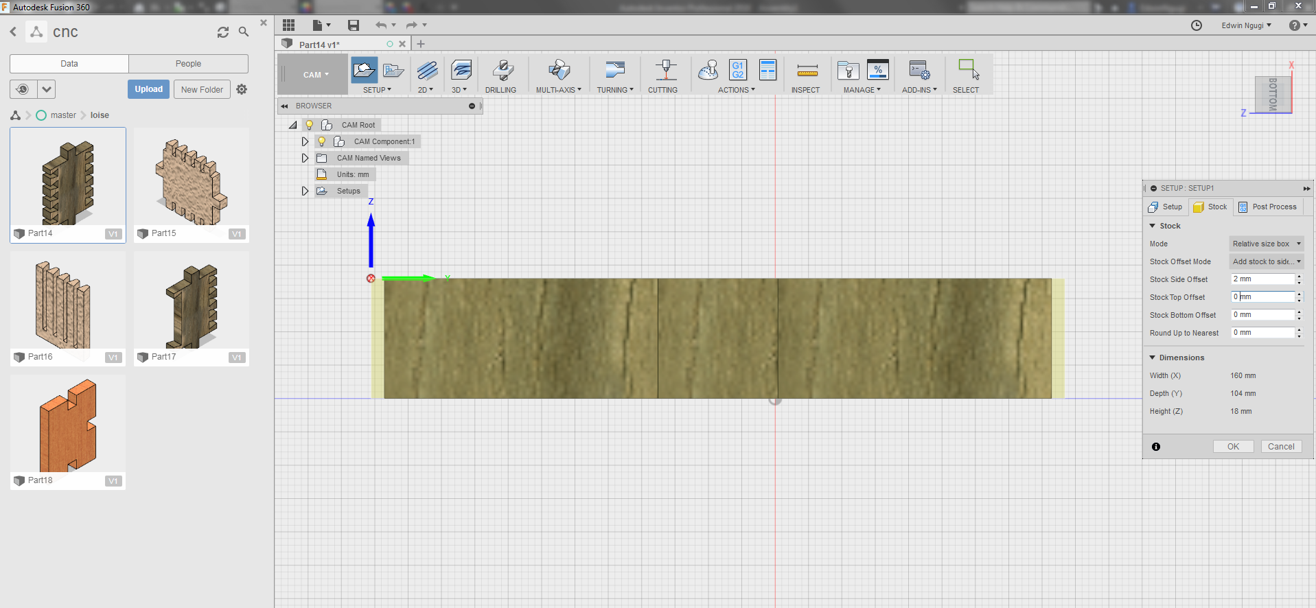 Opened Fusion360 then created a new folder and named it.Then I uploaded the parts that I needed to make the container as you can see on the image. With the help of our lab technician here at Gearbox who assisted me in understanding the whole process for CAM and why we using it. He told me we needed to generate a Gcode fot the CNC machine and be able to select the necessary tools involved and dimension, plus the axis has to be aligned in the right place.Begun by chosing Cam from the drop down then selected the part to generate Cam for in this case its part14 as shown.