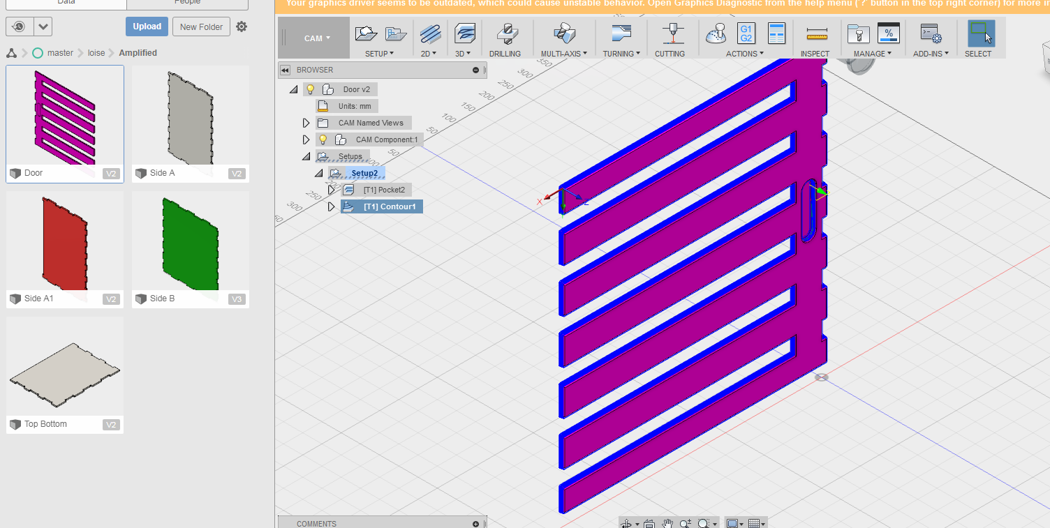 I used Fusion360 to generate the Cam for the design. I went to Autdesk online and created an account then signed in, downloaded the installer and installed it in my laptop. This is to aid in the test runouts , alignments, speeds , feeds and toolpaths for the machine while cutting out the specific designs provided to it. Using this software I specified the neccessary requirements for the parts to be cut out from the wood by the CNC machine. I will just break it down using one of the parts. I did all the parts individually and generated the Gcodes for each.