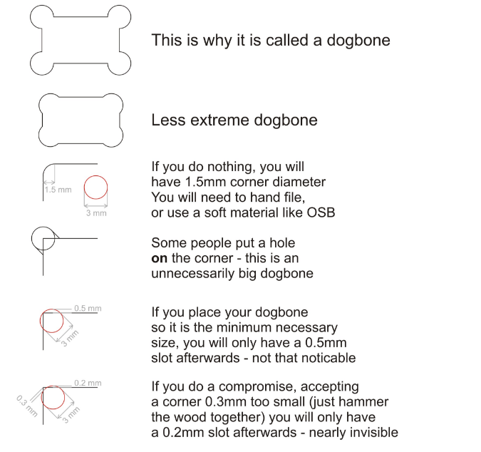 When cutting materials with the CNC, a known problem is that while the CNC can make a perfect outer corner, the inner corners can never be more sharp than the diameter of the cutting tool. So if you are e.g. using a 6mm mill, all the inside corners will not be perfect right angles, but will instead have an inside diameter of 3 mm (half the cutting tool's diameter) Sometimes these small rounded corners don't matter, but they are almost always an issue with joints - where often another piece of plywood, which by nature is square, must fit precisely in a hole or slot. If the hole or slot has very rounded corners, the mating piece just isn't going to fit in.