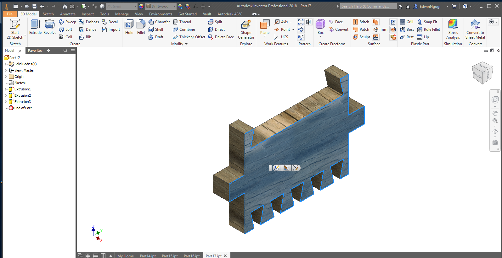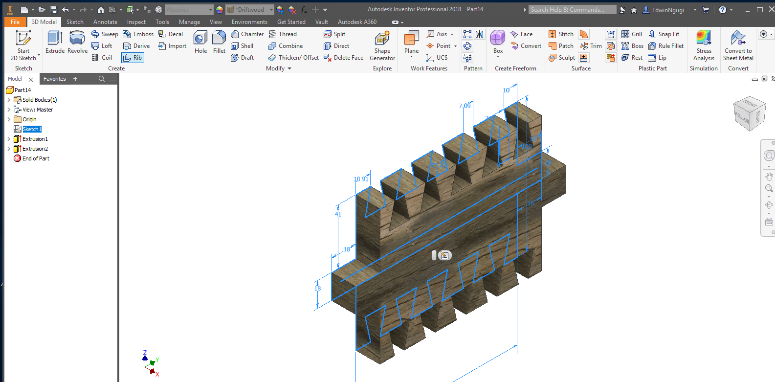I will be designing a wardobe from the previous project.In this case I will be using the through dovetails to interconnect the sides of the wardrobe. I used Inventor software to design the 2D and 3D parts of the wardrobe. As shown;