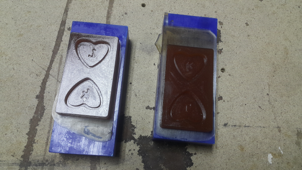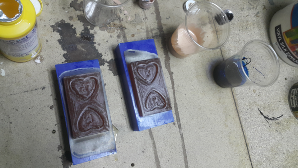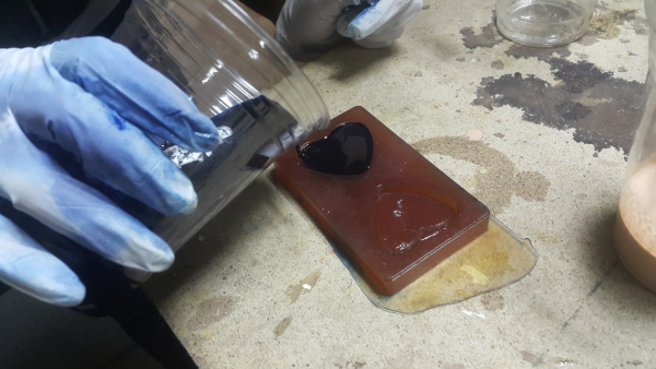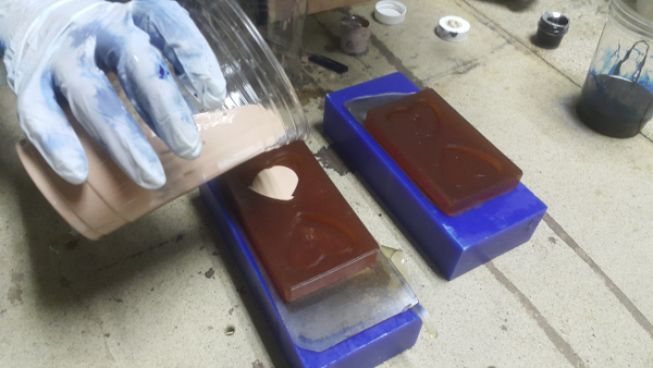 I poured the mixture to the molds as shown. If you let the mixture sit for a while it gets a bit hot as it heals quickly, so i had to be pretty quick to pour the liquid to the mold. I started with the pink mixture then the blue.