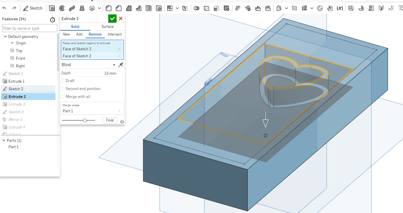 Then I did a sketch on the top surface of the block. This case made a heart shape using free line tool then I mirrored that side. Later extruded the shape by removing the surrounding area.