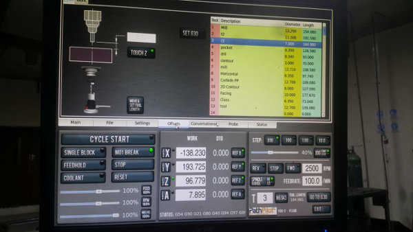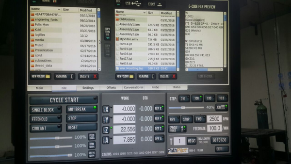 Once all that was done we used the gcode we had generated earlier in the CAM process to load in to the computer for Tormach machine by just plugging the usb. The fist step was to copy the gcode from the usb to the machine as shown that is the molding and casting. On the side you can see the gcode preview of the design. After loading we selected the tool we were using and entered the height for the tool in this case we using tool number one on the menu as shown. The x and y axis positioned them correctly with reference to the wax mounted on the table. Then started the cycle as shown