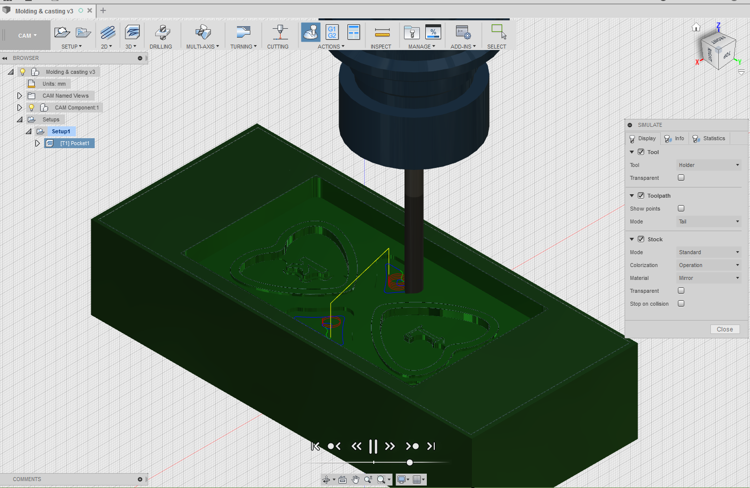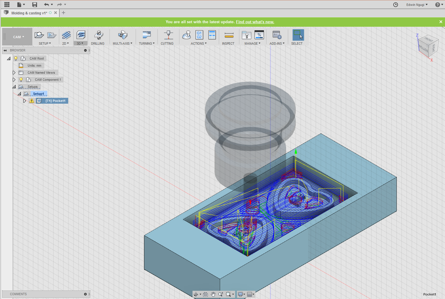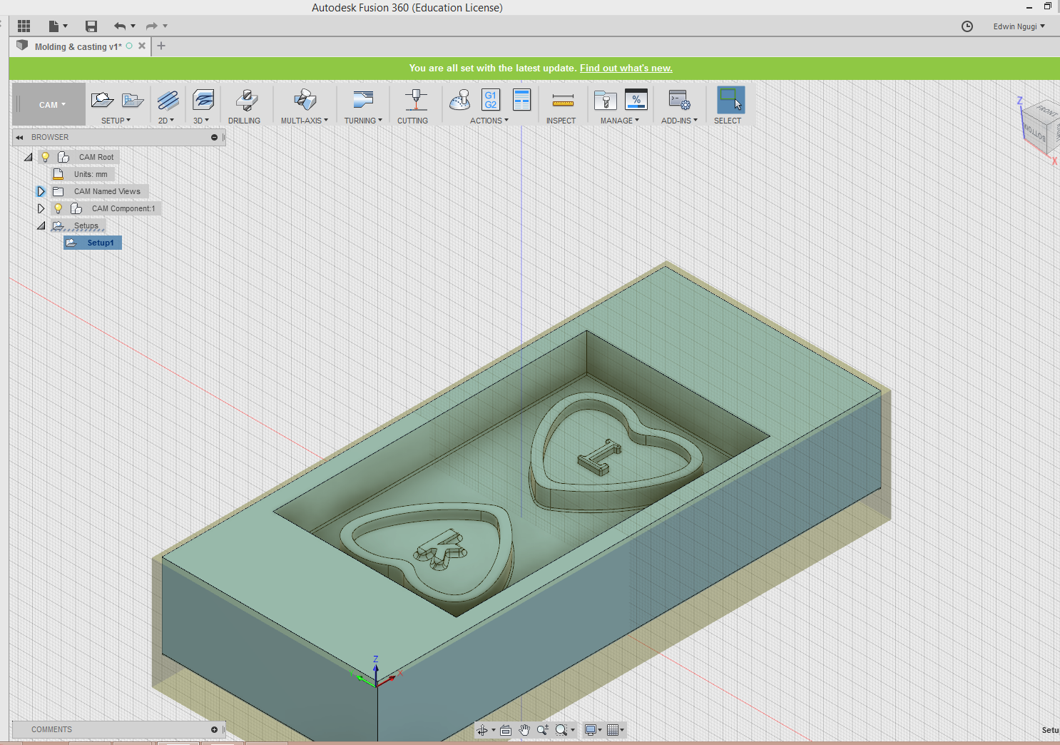To generate cam data for the design I used fusion360.First I downloaded the design file from Onshape software as an IGES file then imported it to Fusion360. Then I selected a CAM process for the design, created a new setup for the using the setup option shown in the menu.You have to reference the cartesian plane for the x, y and z axis to a poitn where you want the machine to start from considering factors of the negative and positive points. I referenced it to the shown position, I used the 3D to select the option I was using for the design and since am only machining the inside part of the wax I chose the pocket the editted a few settting that is the tool to used, setting the speed rate and others. Finaly I did a simulation to see how the tool is going to machine