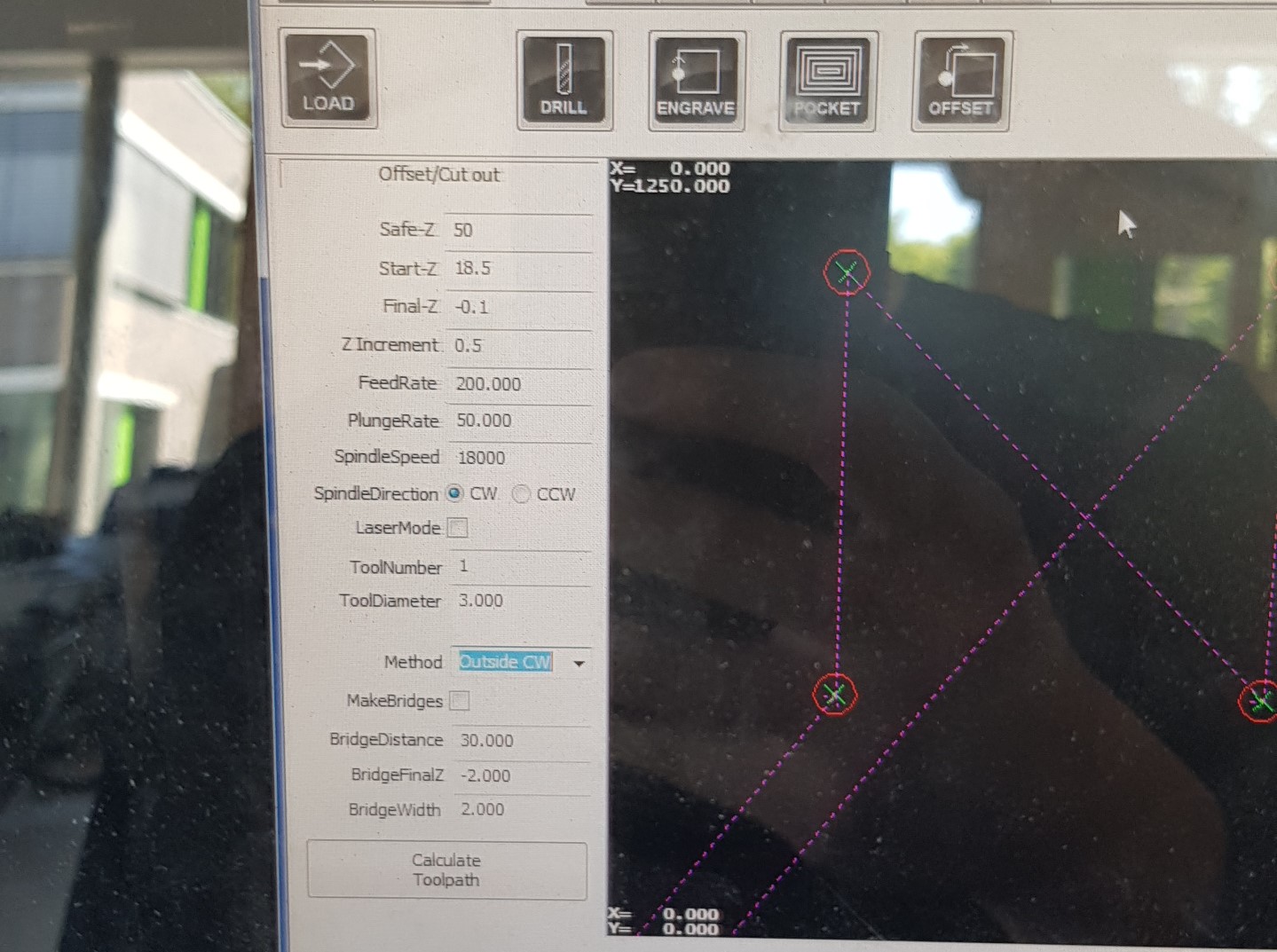 Reminder: Make the holes at least 6.2mm at the ages in DMSettings for some offset of nema17Settings for the CutOutDone xDHere you can see pocket for the motor.This is how the assembled machine looks like, you can also see some drawing examples, that we made with this machine.AnalyseWell as I have told before, we have splitted the tasks between us, so that each single member had to make 1 axies, ofcourse we had to collaborate with each other, because the part that we had to design at our own should fit together.