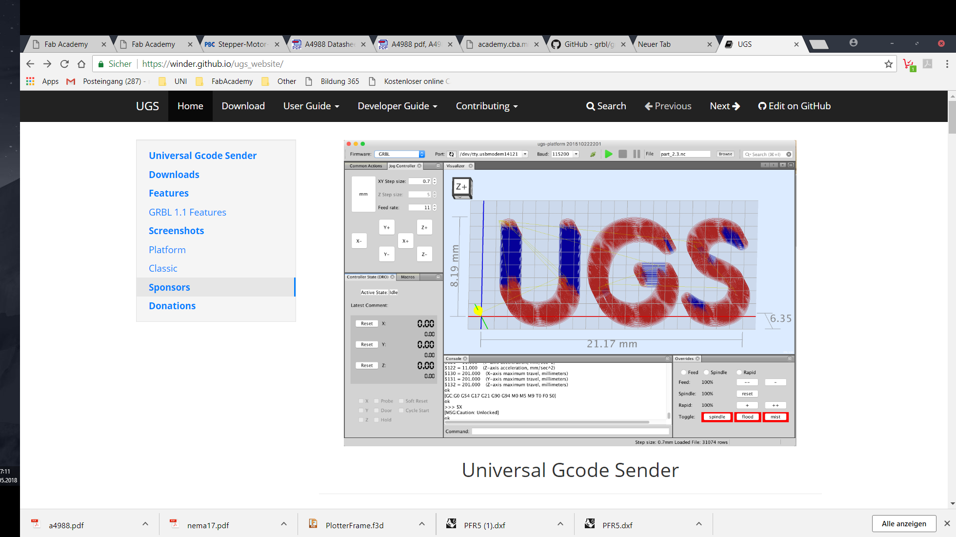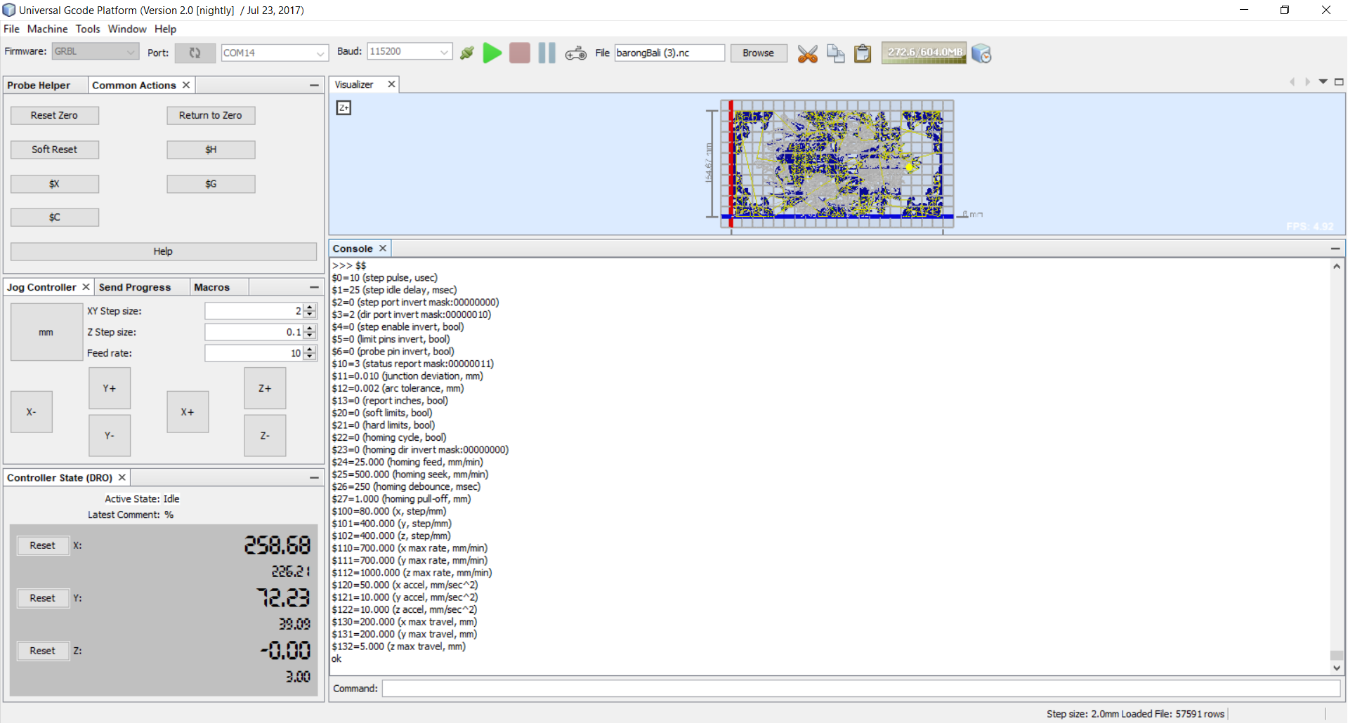 Okay for the x axies we have use the RepRap calculator .Okay to lauch the code we have downloaded the USG platform.After this we had to set the steps per min for each axies. To list the GRBL variables type $$.