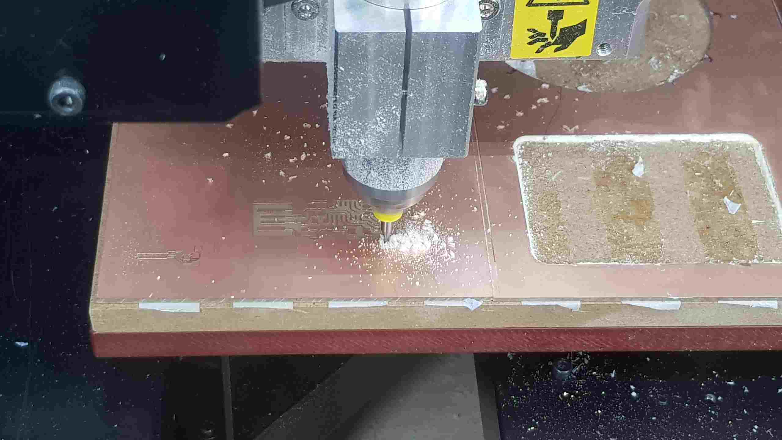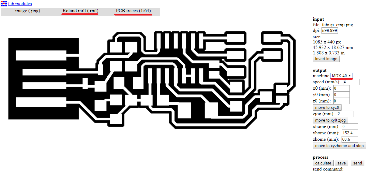 To mill our PCB boards have Roland MDX-40A. In order to work with this machine we need a GCode. To generate a GCode we had 2 PNG files, one for traces and another for the frame, and GCode generator. To generate a GCode from the PNG's we had used Fabmodules