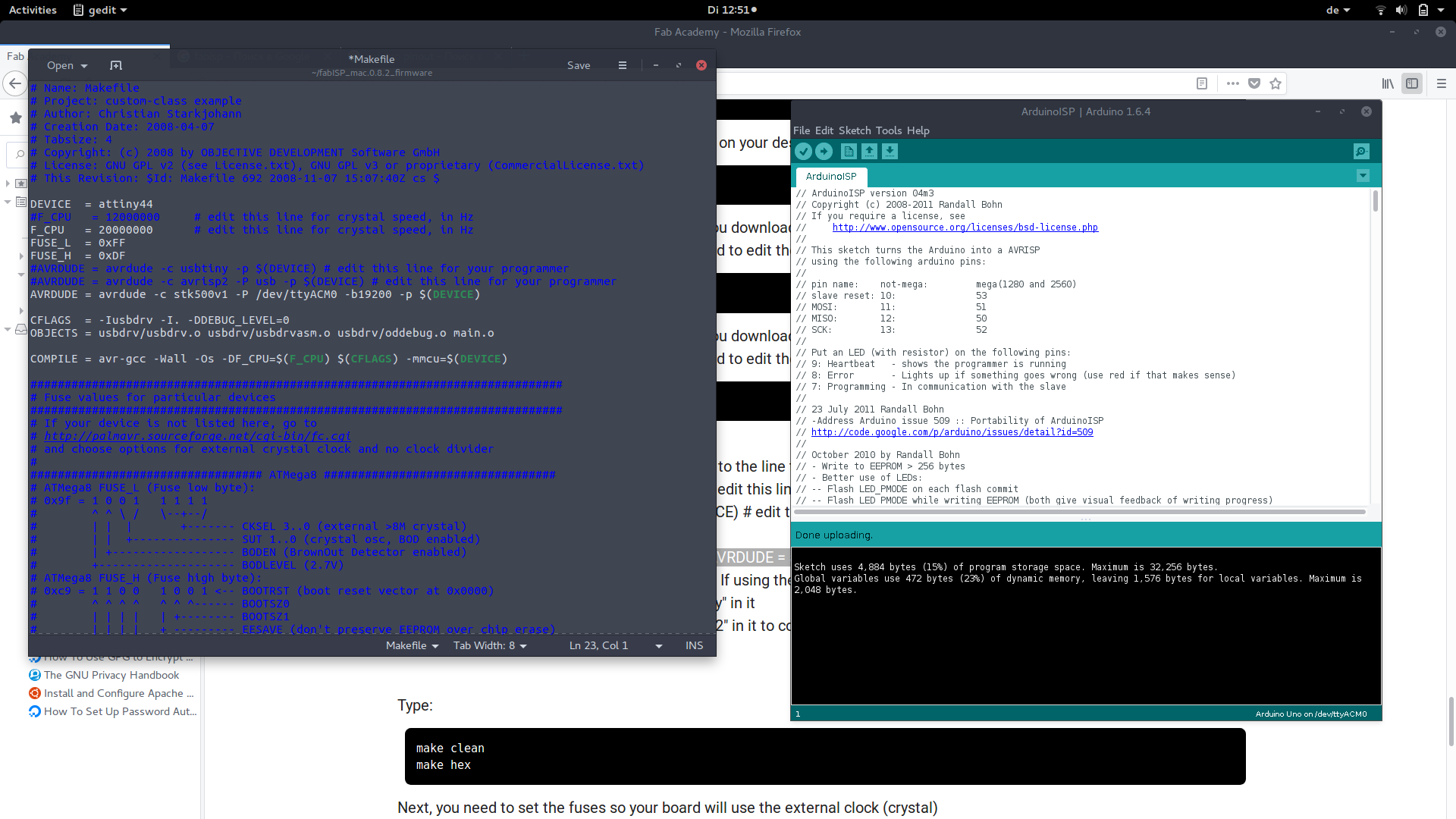 The Makefile is in the firmware directory that you downloaded. The Makefile is set up to work with the AVRISP2 by default. If you are using another programmer, you will need to edit the Makefile. In my case, I have to edit it. Use gedit Makefile to do so.