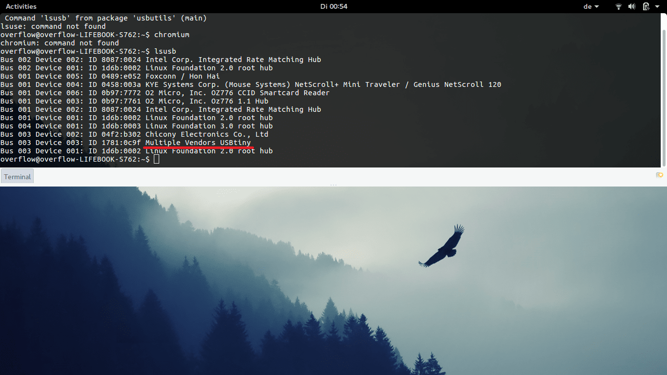 If your FabISP has been successfully programmed, you should see a list of the USB devices plugged into your computer. Here is the command for it: