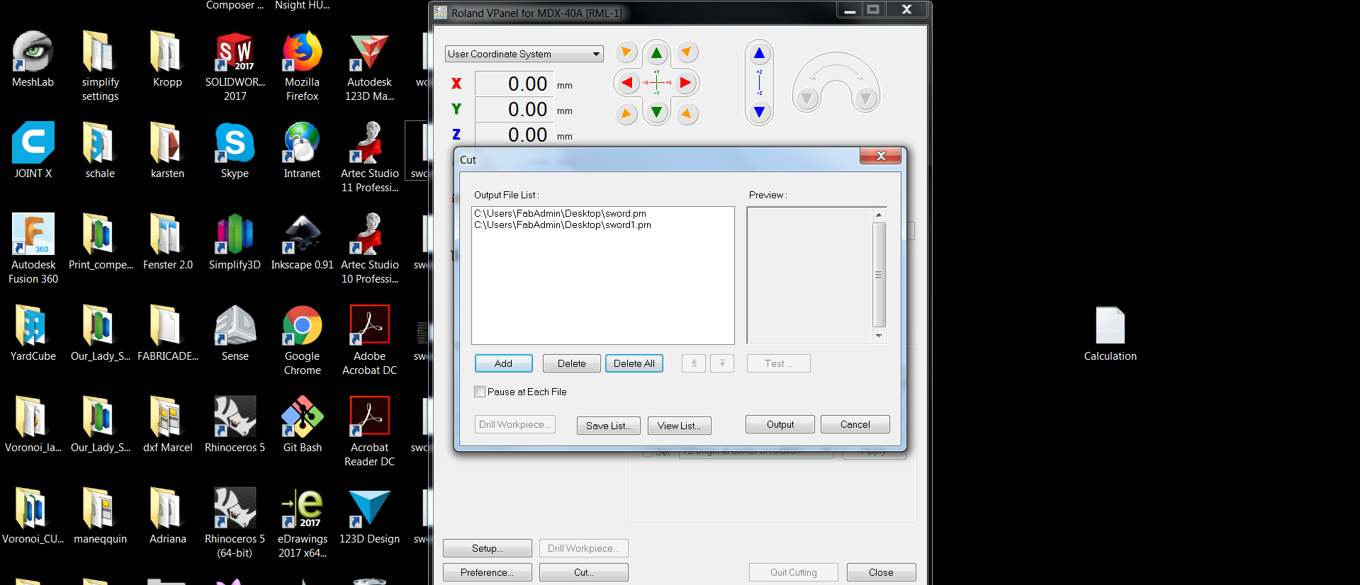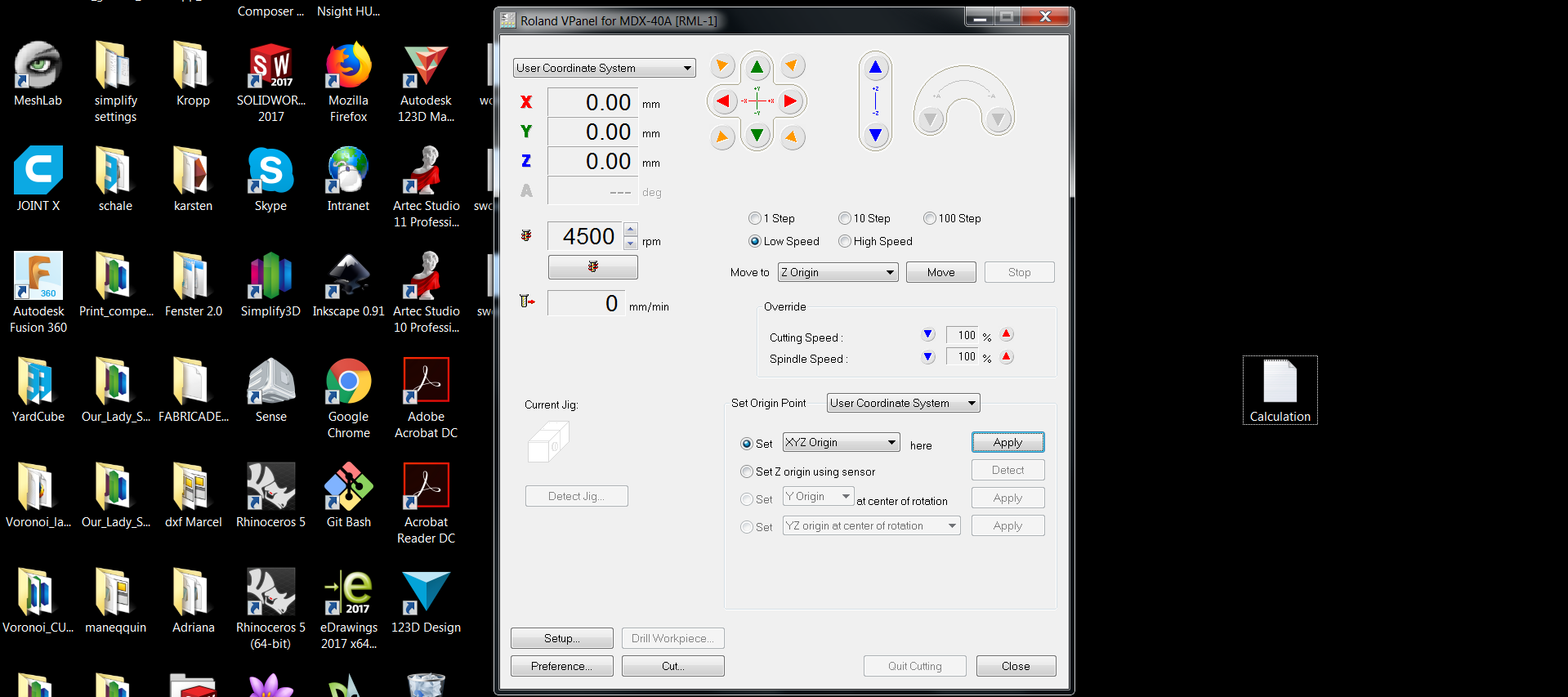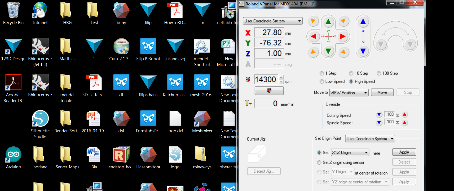 Here he have to start the Programm 'VPanel' -> the machine should be on, otherwise the programm will not recognize a machine. VPanel is the GCode output programm for the Roland MDX-4A.