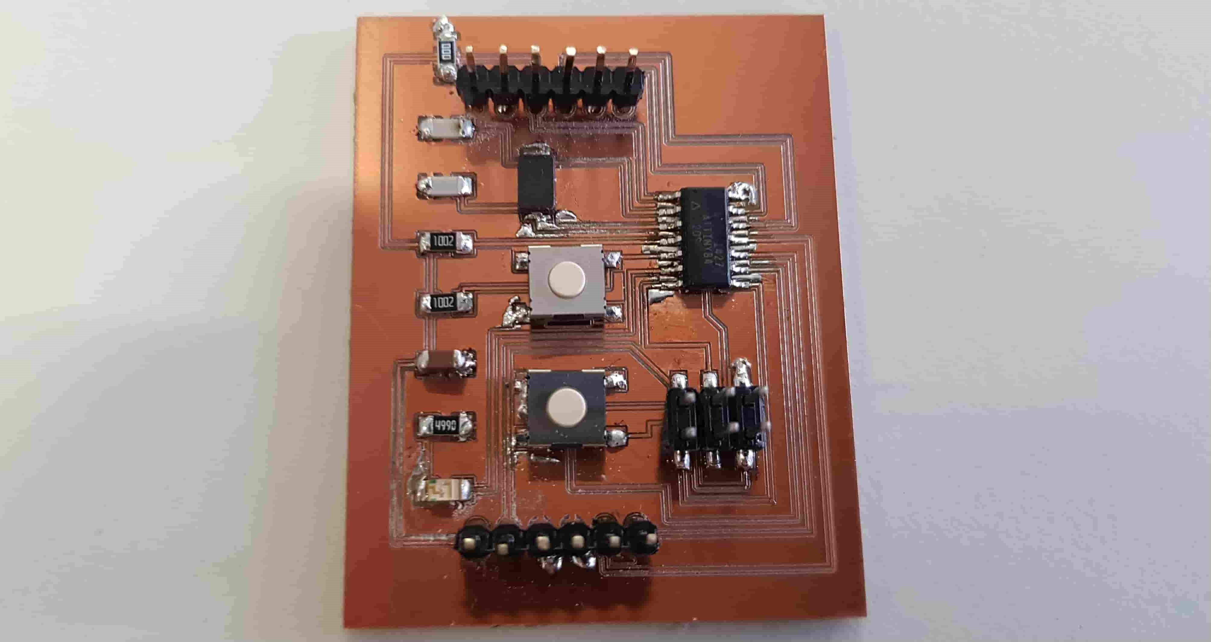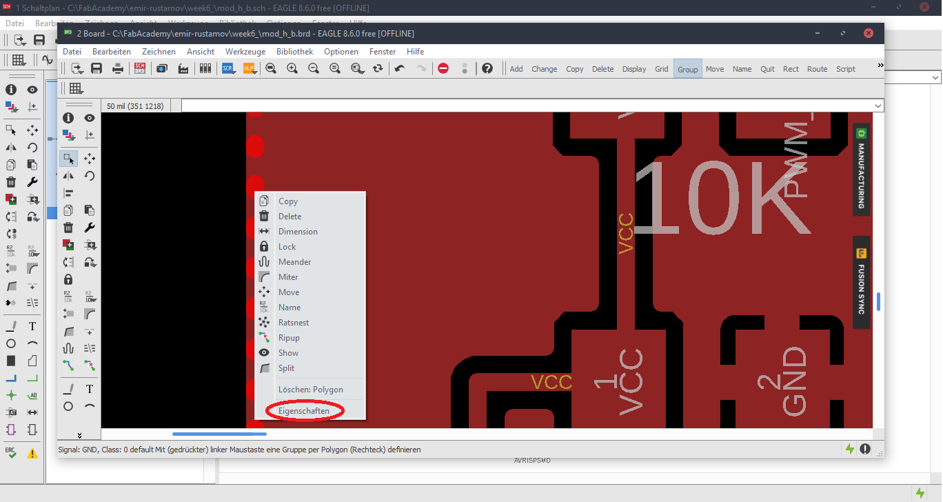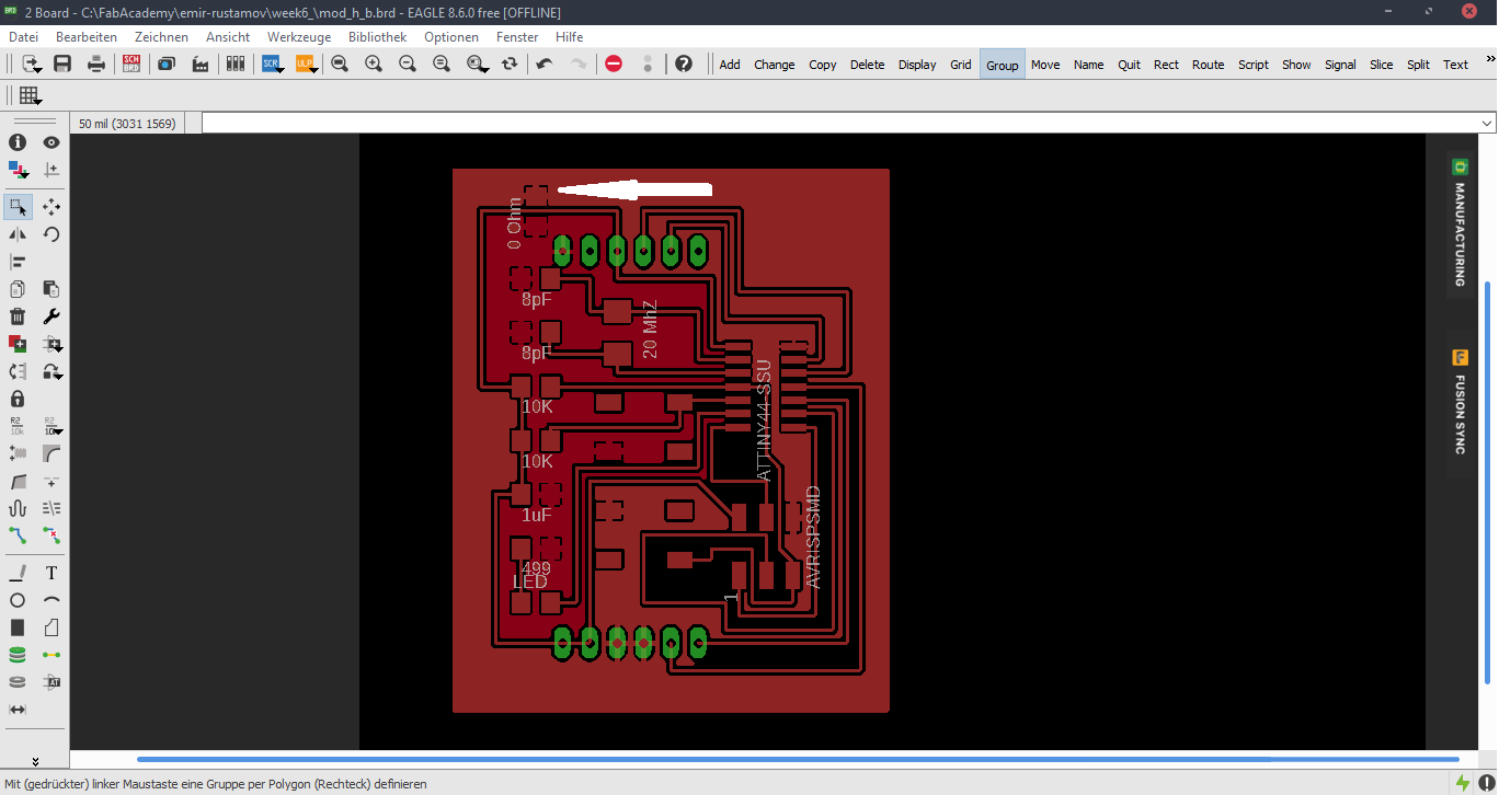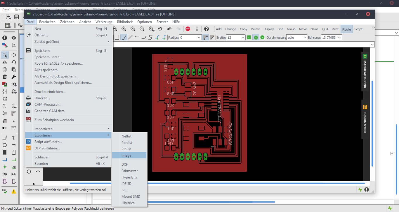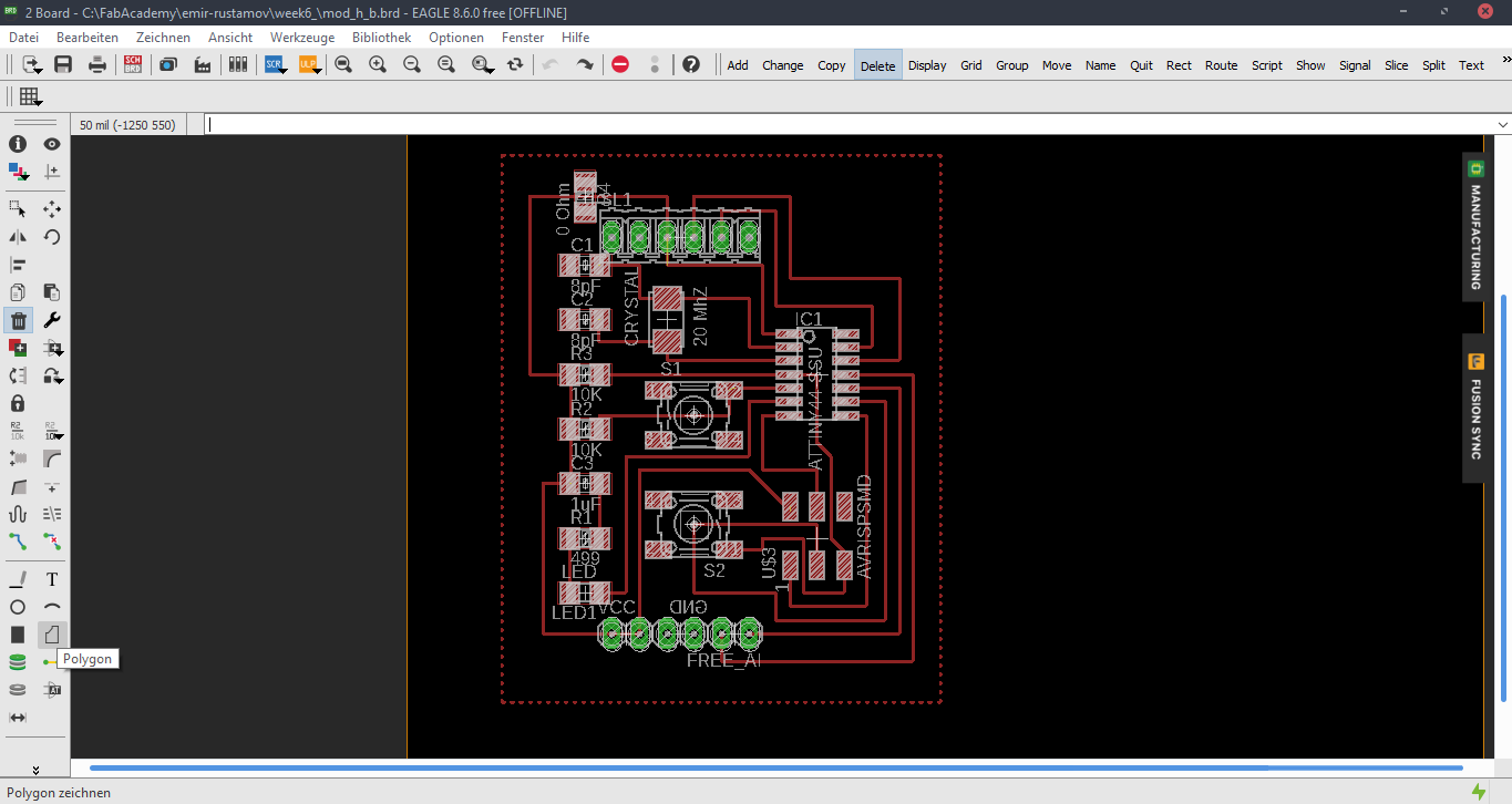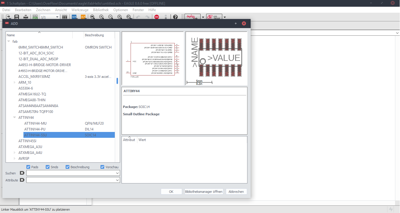 Now we are at the Schematic window. Okay first we have to add the needed Library, to do this first click to the Add button, like in the picture below.Now Open the Bibliothek Manager and add the libraly, you have downlaoded before.Attiny44Now click to the same Add button, that I mentioned before and you will be able to find a fab library, that you have included, with the previous step. Here you can find all needed logical components, that you need. For example ATTiny44First stepsOne nice this, that i like about the Eagle is that the pins have names, and you can easily figure out which pins you have to use for Power, GND and programming, the Crystal pins are also highlighted there. To add Labels and connections you have buttons at the left menu side of the window. In order to change the values and names of the components, you have to zoom in to the placed component and right-click on it.Okay this is how my logical pin layot looks like.CrystalI have used 20 Mhz Crystal, and for this specific crystal we need 8 pF Capasitors connected to the ground.ButtonI have added a button, the buttons requires 10k resistors to limit the curren tflow.Reset ButtonI have also added a reset button.LEDHere we have a LED it requires 499 Ohm resistor again the same, to limit the current flow.According to the DC Forward Current of the datasheet I have to use 499 ResistorPinsThese are FTDI and AVRISP pinsPower GND Analog PinsI have also mentioned, that we have got two analog pins, that we can use later, so I have made pins for them. I have also added 0Ohm resistor as Jumper, but I have done after I have placed all my components in boardlayout. Okay after we have have finished with the logical connections, we have to play all aour componens in a proper way in Board Layout. to switch the window click circled to the button above.RoutesTo create the routes, you have got an icon in the bottom-left corner. You can also specify th thickness of the routes above. In my case I have use 0.12 mm.GroundI some cases you can skip the connections of the GND. Make the whole unused space of the board to the GND. To do this, we have first to create a polygon. You can also find it in the bottom-left corner.Fill the GNDFill the unused spaces, we have to click RatsnestProperties of the GNDThan zoom in to the border of the GND, right-click on it and click Properties.IsolationIn the Properties we have to change the isolation. Isolation, is the space, between GND and Traces or components. It is recomended to change it according to the width of the routes.0 Ohm JumperOkay, here you can clearly see why I have used the 0 Ohm Jumper. After I have placed and connected all components. I had an issue with the Ground. The Gounds were not connected. So i have added the 0 Ohm resistor as a solution.ExportNow we have to export out Board Layout as an image.Export SettingsThese are recomended exporting settings.Exporting SettingsNow you have to crop the unnecessary borders from your image. It should look something like this.Now you have to cut out the engraving space sout and save the image for the cutout(Roland).MillingI will not explain how, we have to create a GCode out of the images. It is explained here.After MillingAfter SolderingProgrammingOkay now I am going to program my Board with FabISPOkay first of all we have to connect our Board in a proper way.