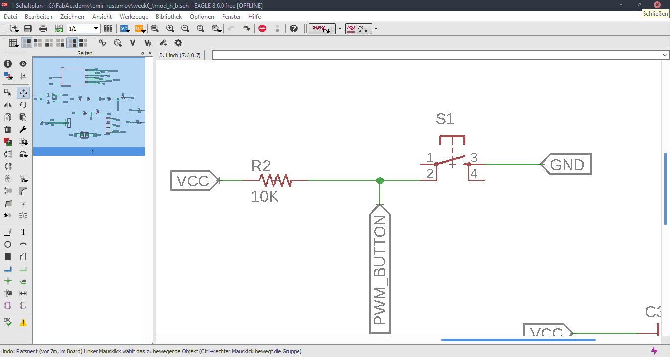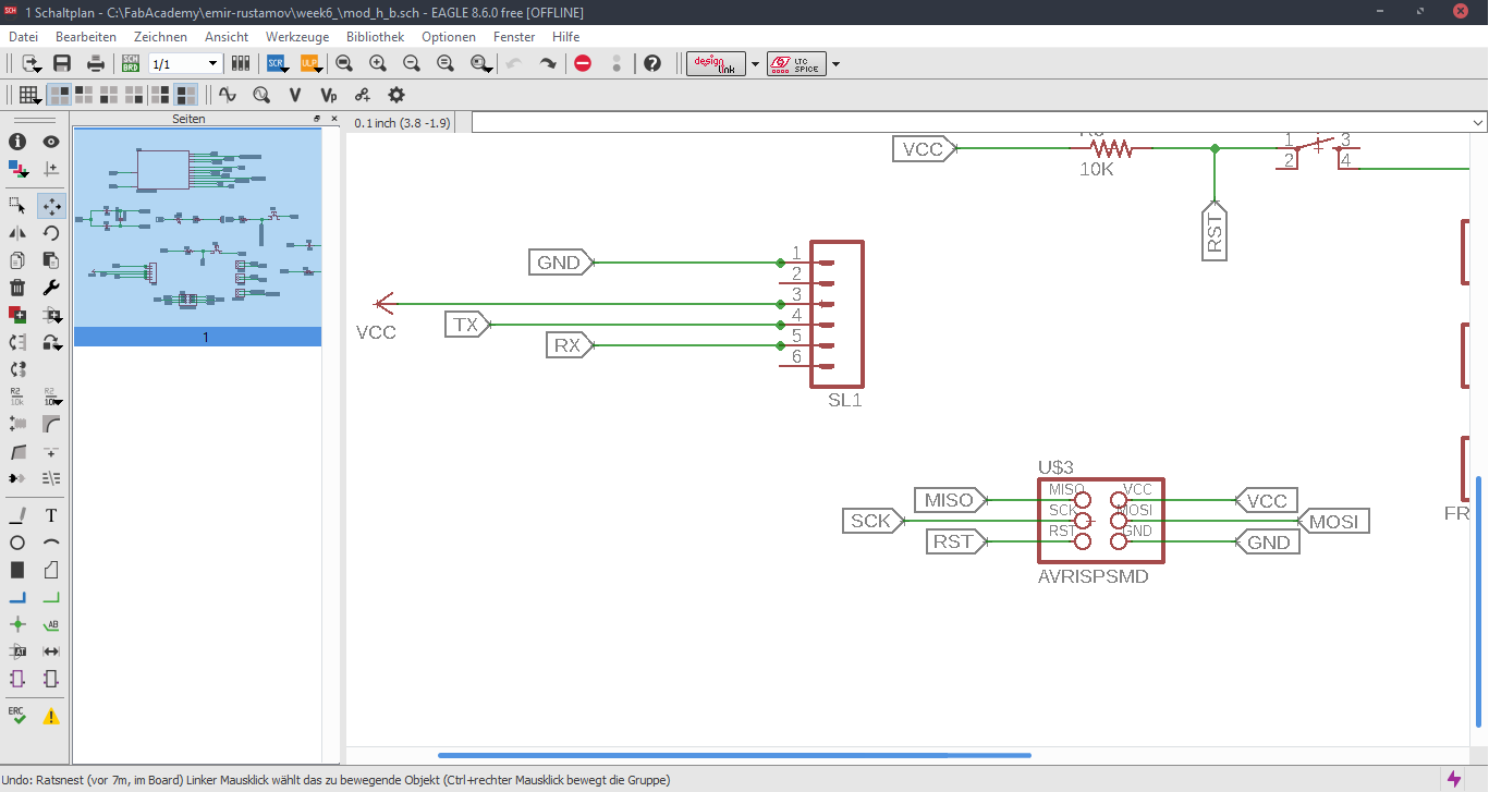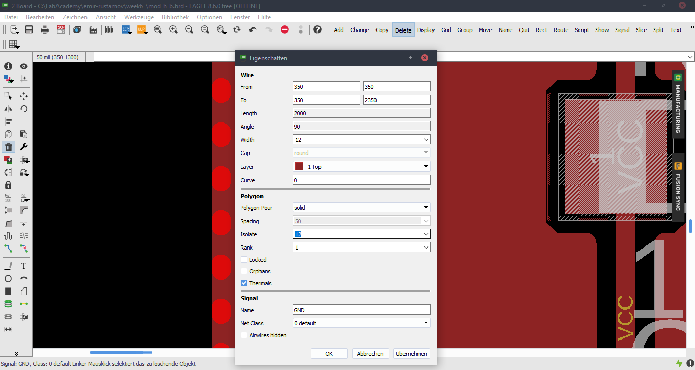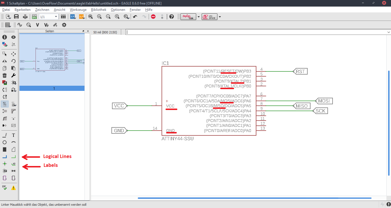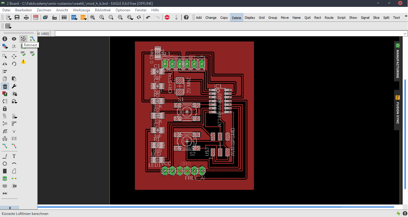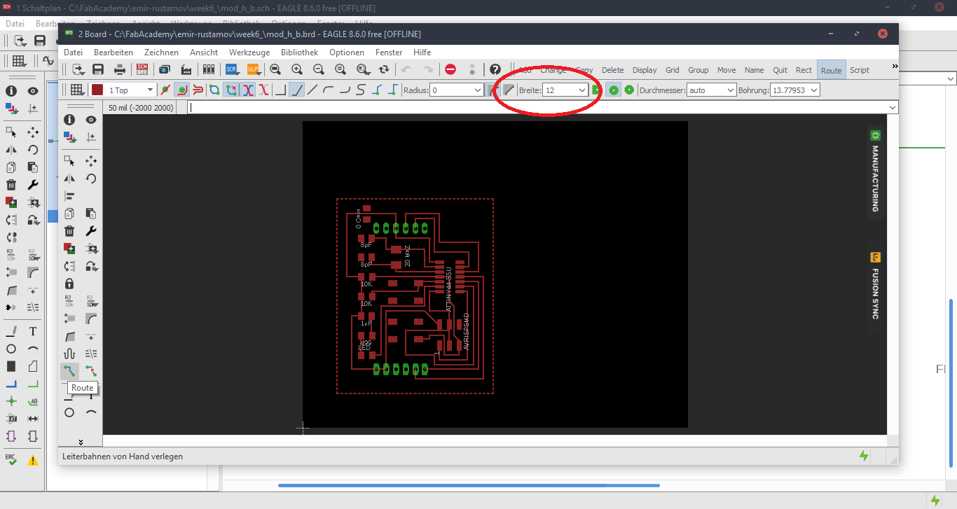 Now we are at the Schematic window. Okay first we have to add the needed Library, to do this first click to the Add button, like in the picture below.Now Open the Bibliothek Manager and add the libraly, you have downlaoded before.Attiny44Now click to the same Add button, that I mentioned before and you will be able to find a fab library, that you have included, with the previous step. Here you can find all needed logical components, that you need. For example ATTiny44First stepsOne nice this, that i like about the Eagle is that the pins have names, and you can easily figure out which pins you have to use for Power, GND and programming, the Crystal pins are also highlighted there. To add Labels and connections you have buttons at the left menu side of the window. In order to change the values and names of the components, you have to zoom in to the placed component and right-click on it.Okay this is how my logical pin layot looks like.CrystalI have used 20 Mhz Crystal, and for this specific crystal we need 8 pF Capasitors connected to the ground.ButtonI have added a button, the buttons requires 10k resistors to limit the curren tflow.Reset ButtonI have also added a reset button.LEDHere we have a LED it requires 499 Ohm resistor again the same, to limit the current flow.According to the DC Forward Current of the datasheet I have to use 499 ResistorPinsThese are FTDI and AVRISP pinsPower GND Analog PinsI have also mentioned, that we have got two analog pins, that we can use later, so I have made pins for them. I have also added 0Ohm resistor as Jumper, but I have done after I have placed all my components in boardlayout. Okay after we have have finished with the logical connections, we have to play all aour componens in a proper way in Board Layout. to switch the window click circled to the button above.RoutesTo create the routes, you have got an icon in the bottom-left corner. You can also specify th thickness of the routes above. In my case I have use 0.12 mm.GroundI some cases you can skip the connections of the GND. Make the whole unused space of the board to the GND. To do this, we have first to create a polygon. You can also find it in the bottom-left corner.Fill the GNDFill the unused spaces, we have to click RatsnestProperties of the GNDThan zoom in to the border of the GND, right-click on it and click Properties.IsolationIn the Properties we have to change the isolation. Isolation, is the space, between GND and Traces or components. It is recomended to change it according to the width of the routes.0 Ohm JumperOkay, here you can clearly see why I have used the 0 Ohm Jumper. After I have placed and connected all components. I had an issue with the Ground. The Gounds were not connected. So i have added the 0 Ohm resistor as a solution.ExportNow we have to export out Board Layout as an image.Export SettingsThese are recomended exporting settings.Exporting SettingsNow you have to crop the unnecessary borders from your image. It should look something like this.Now you have to cut out the engraving space sout and save the image for the cutout(Roland).MillingI will not explain how, we have to create a GCode out of the images. It is explained here.After MillingAfter SolderingProgrammingOkay now I am going to program my Board with FabISPOkay first of all we have to connect our Board in a proper way.