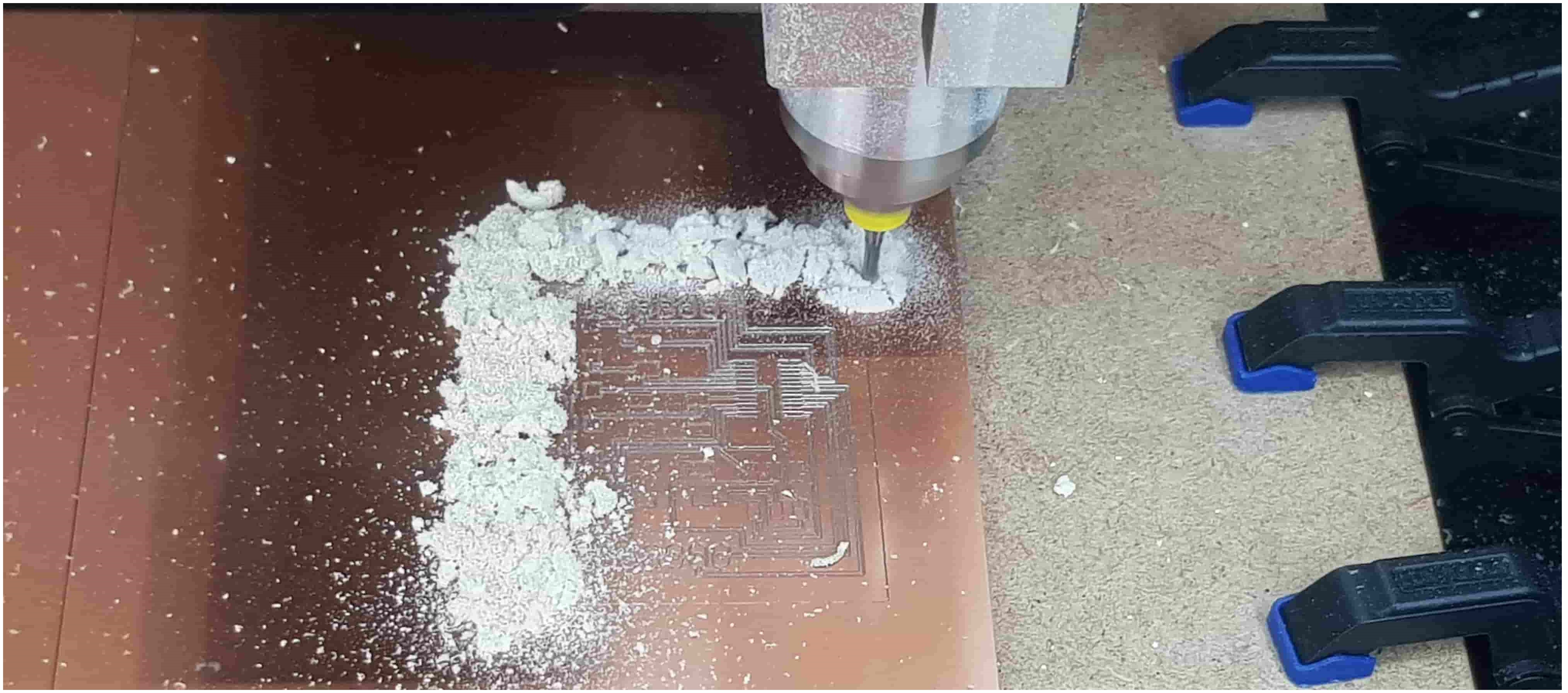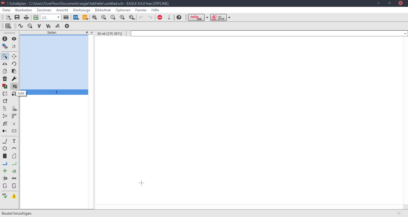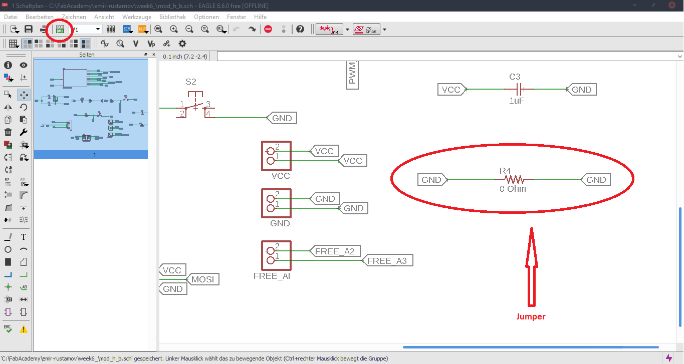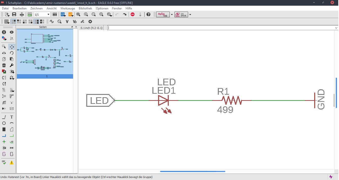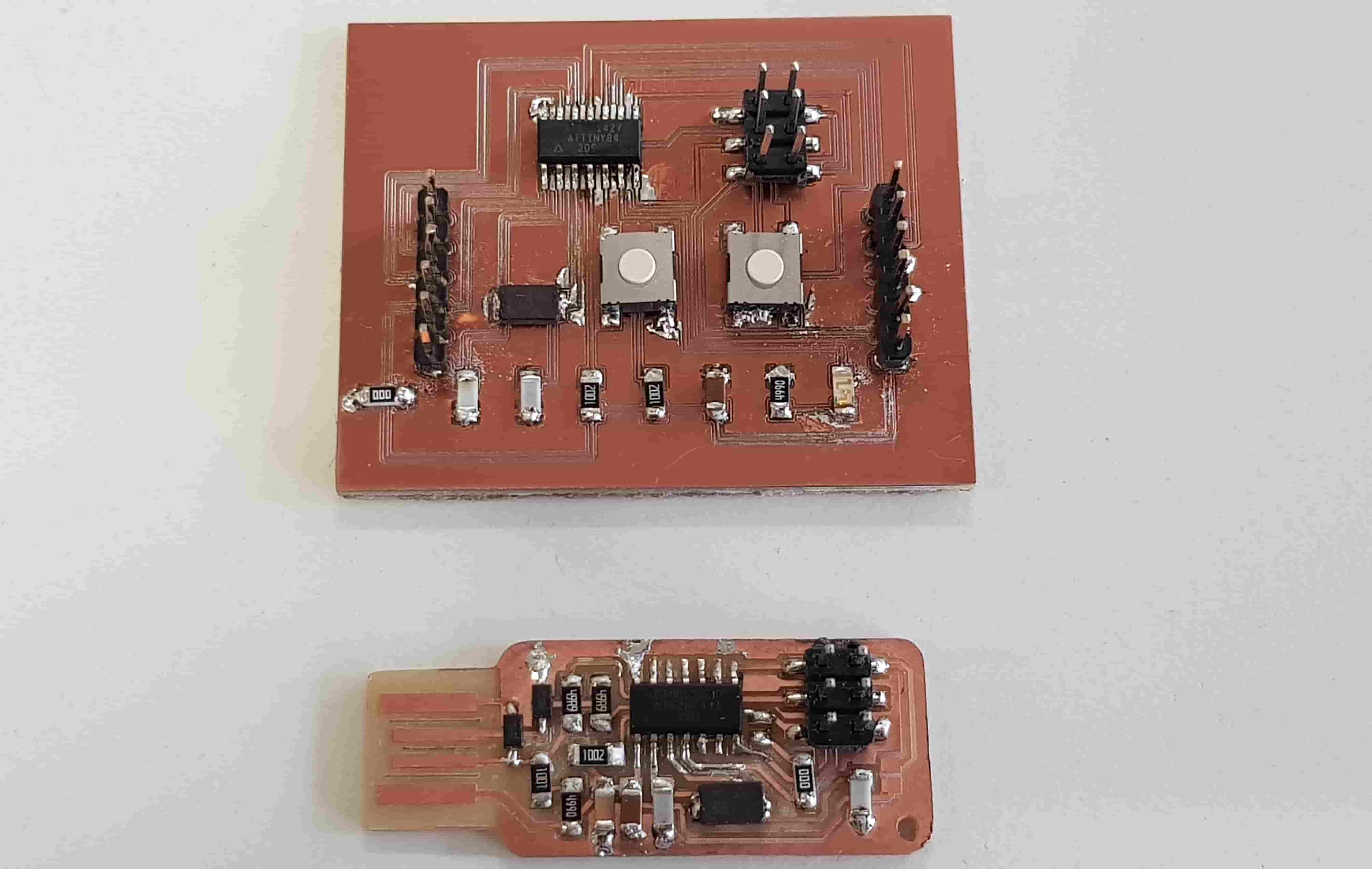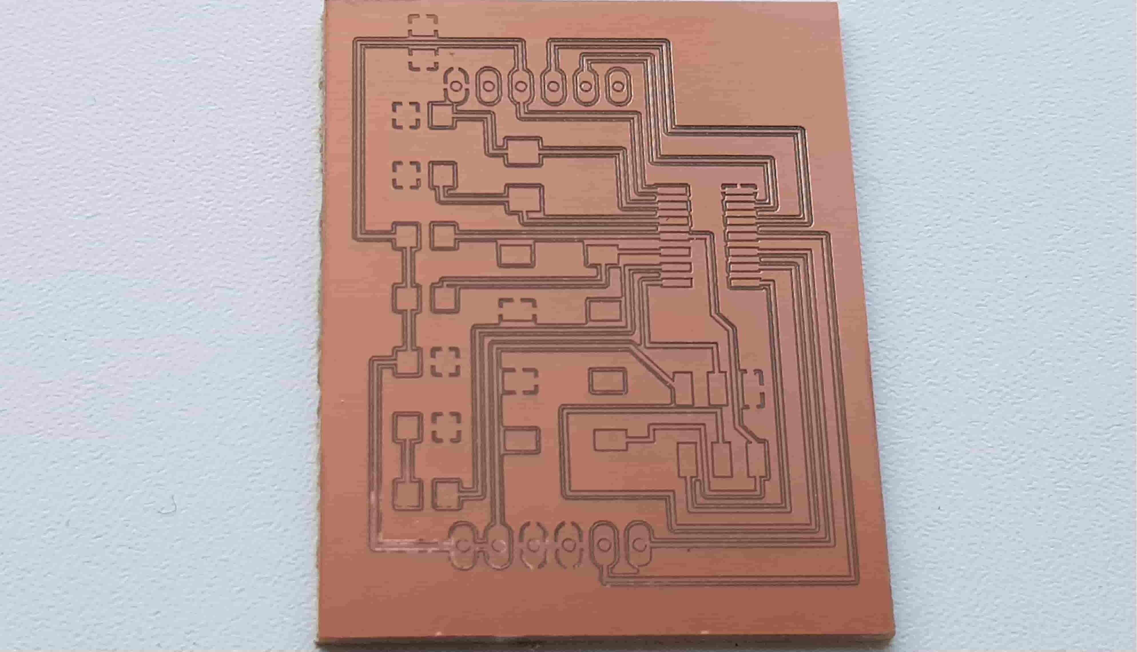 Now we are at the Schematic window. Okay first we have to add the needed Library, to do this first click to the Add button, like in the picture below.Now Open the Bibliothek Manager and add the libraly, you have downlaoded before.Attiny44Now click to the same Add button, that I mentioned before and you will be able to find a fab library, that you have included, with the previous step. Here you can find all needed logical components, that you need. For example ATTiny44First stepsOne nice this, that i like about the Eagle is that the pins have names, and you can easily figure out which pins you have to use for Power, GND and programming, the Crystal pins are also highlighted there. To add Labels and connections you have buttons at the left menu side of the window. In order to change the values and names of the components, you have to zoom in to the placed component and right-click on it.Okay this is how my logical pin layot looks like.CrystalI have used 20 Mhz Crystal, and for this specific crystal we need 8 pF Capasitors connected to the ground.ButtonI have added a button, the buttons requires 10k resistors to limit the curren tflow.Reset ButtonI have also added a reset button.LEDHere we have a LED it requires 499 Ohm resistor again the same, to limit the current flow.According to the DC Forward Current of the datasheet I have to use 499 ResistorPinsThese are FTDI and AVRISP pinsPower GND Analog PinsI have also mentioned, that we have got two analog pins, that we can use later, so I have made pins for them. I have also added 0Ohm resistor as Jumper, but I have done after I have placed all my components in boardlayout. Okay after we have have finished with the logical connections, we have to play all aour componens in a proper way in Board Layout. to switch the window click circled to the button above.RoutesTo create the routes, you have got an icon in the bottom-left corner. You can also specify th thickness of the routes above. In my case I have use 0.12 mm.GroundI some cases you can skip the connections of the GND. Make the whole unused space of the board to the GND. To do this, we have first to create a polygon. You can also find it in the bottom-left corner.Fill the GNDFill the unused spaces, we have to click RatsnestProperties of the GNDThan zoom in to the border of the GND, right-click on it and click Properties.IsolationIn the Properties we have to change the isolation. Isolation, is the space, between GND and Traces or components. It is recomended to change it according to the width of the routes.0 Ohm JumperOkay, here you can clearly see why I have used the 0 Ohm Jumper. After I have placed and connected all components. I had an issue with the Ground. The Gounds were not connected. So i have added the 0 Ohm resistor as a solution.ExportNow we have to export out Board Layout as an image.Export SettingsThese are recomended exporting settings.Exporting SettingsNow you have to crop the unnecessary borders from your image. It should look something like this.Now you have to cut out the engraving space sout and save the image for the cutout(Roland).MillingI will not explain how, we have to create a GCode out of the images. It is explained here.After MillingAfter SolderingProgrammingOkay now I am going to program my Board with FabISPOkay first of all we have to connect our Board in a proper way.