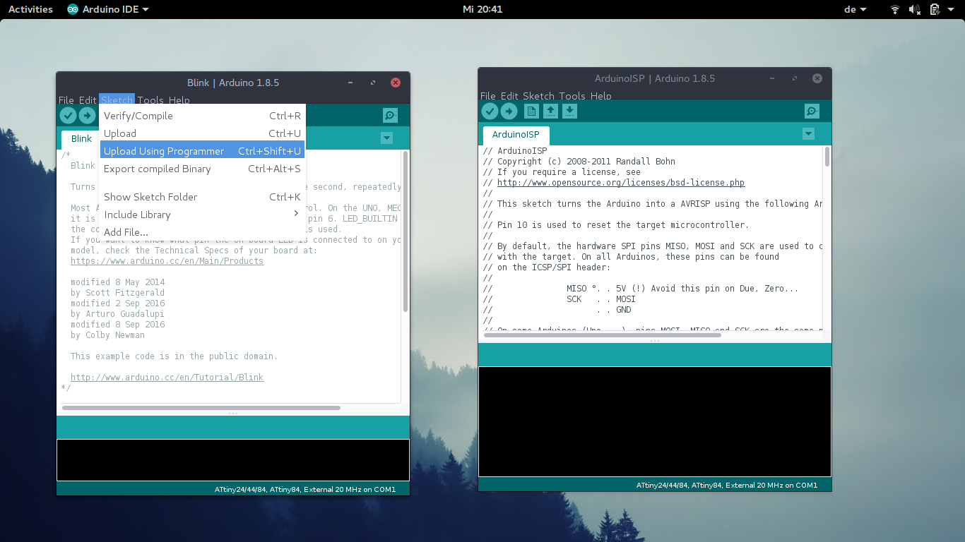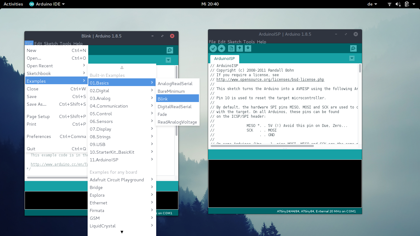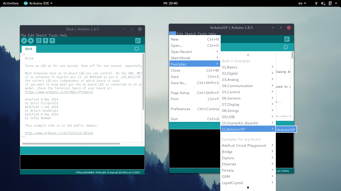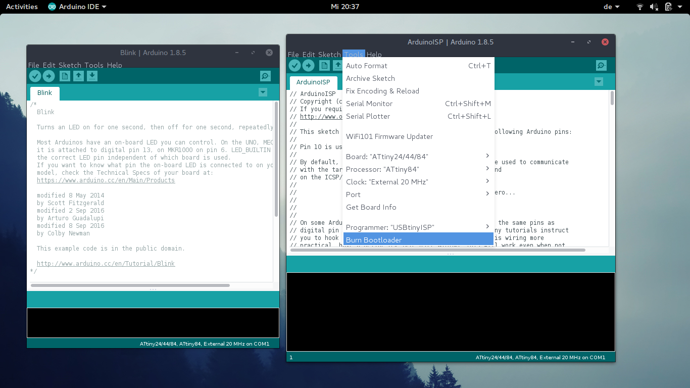 Arduino IDEOkay after we conneted everything in a proper way, we have to open ArduinoISP in Arduino IDESelect everything in a proper way. And burn boot loader.